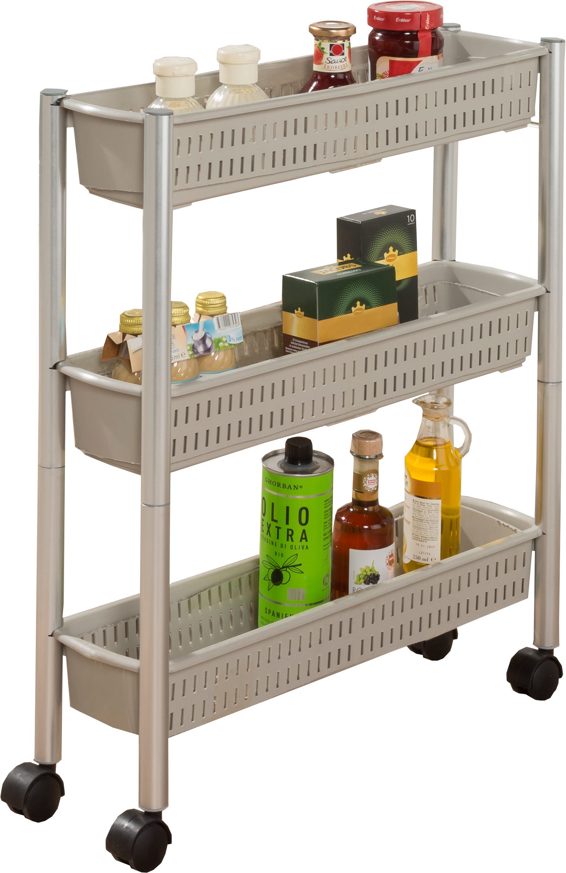 Schaffen Sie in Lücken oder Nischen neue Platzreserven für Küche oder Bad. Die drei geräumigen Körbe lassen sich je nach Bedarf mit Vorräten, Putz- oder Spülmitteln bestücken. Bequem zu Verschieben durch vier stabile Doppelleichtlaufrollen. Stabile Konstruktion aus Aluminium und Kunststoff. Made in Germany.