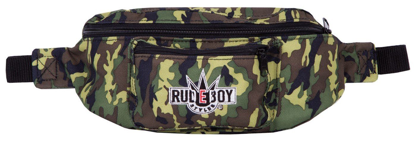 Eine Bauchtasche Hüfttasche im Retro Style von Rudeboy Stylee mit einer Gurtlänge von 131cm, dem Stickmotiv "Rudeboy Stylee", einer Front- und einer Haupttasche für Geldbörse, Handy, Smart Phone, MP3-Player und Schlüssel. Die Hüfttasche besteht aus Polyester im Cordurastyle, hat eine Breite von 24,5 cm und eine Höhe von 12 cm. Die Fronttasche ist 13,5 cm breit und 8 cm hoch. Front- und Haupttasche sind mit einem Reißverschluss versehen. Das Gewicht der Oldschool Hüfttasche liegt bei ca. 120 g.