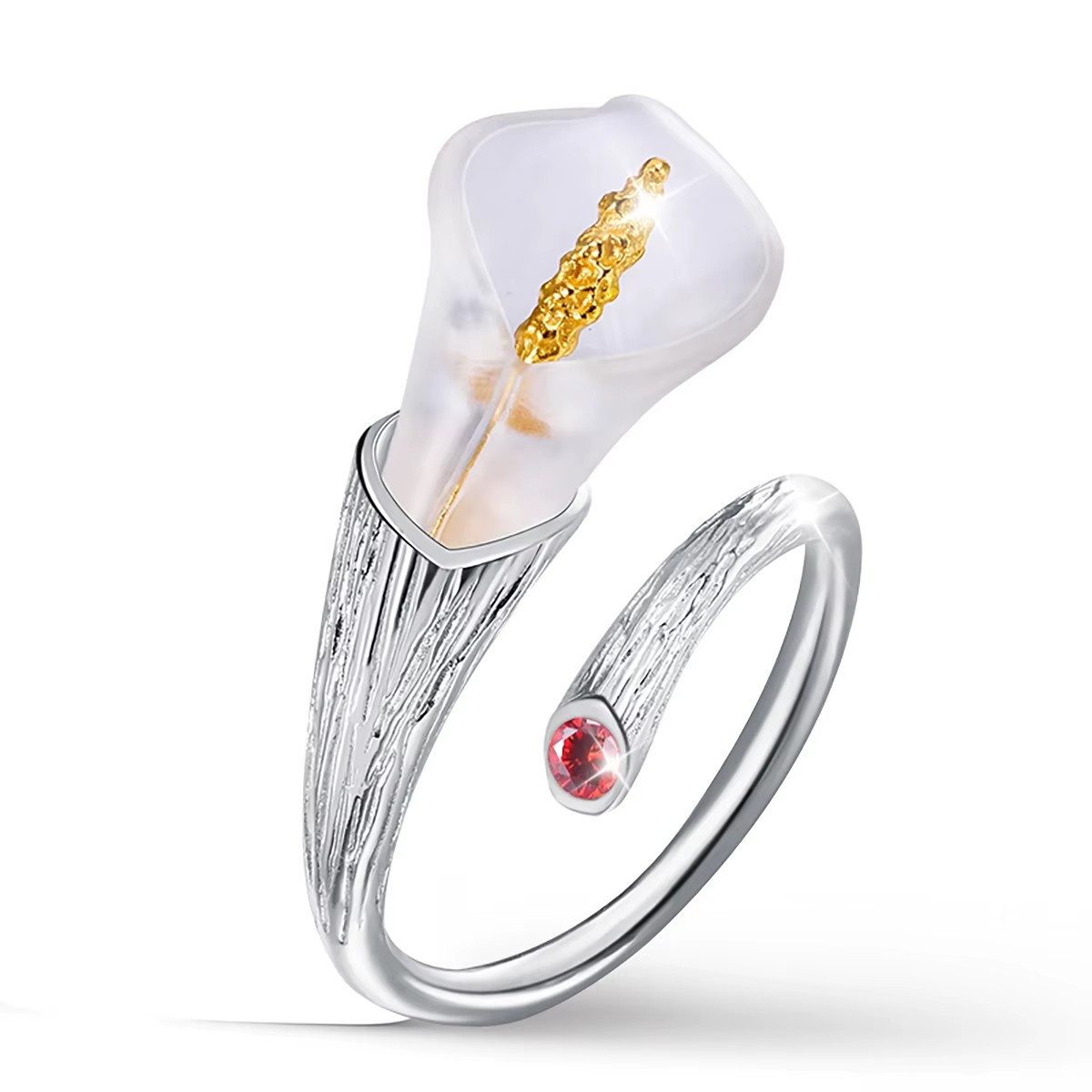 Dieser elegante Lilien-Ring für Damen vereint zeitlose Schönheit mit hochwertiger Handwerkskunst. Gefertigt aus echtem 925 Sterling Silber, begeistert der Ring mit einer zarten Calla-Lilienblüte aus natürlichem Kristall. Das goldplattierte Staubblatt und der leuchtend rote Zirkonia-Stein setzen luxuriöse Akzente und machen den Ring zu einem stilvollen Hingucker. Dank der offenen Ringschiene lässt sich der Ring individuell anpassen – perfekt für den Alltag oder besondere Anlässe wie Hochzeiten, Feiern oder als liebevolles Geschenk.