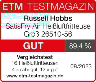 Die Russell Hobbs SatisFry Air Heißluftfritteuse Groß 26510-56 erzielt im Vergleichstest des „ETM TESTMAGAZINS“ mit 15 weiteren Heißluftfritteusen das Gesamtergebnis „gut (89,4 %)“. Die „gute“ Funktionalität überzeugt bei Convenience Food, Fleisch- und Fischspeisen sowie bei Gemüse. Das Gerät ist einfach zu bedienen und sehr leicht zu reinigen. Außerdem bietet es eine hervorragende Sicherheit. Insgesamt gehört die Heißluftfritteuse zum Mittelfeld des starken Testspektrums.