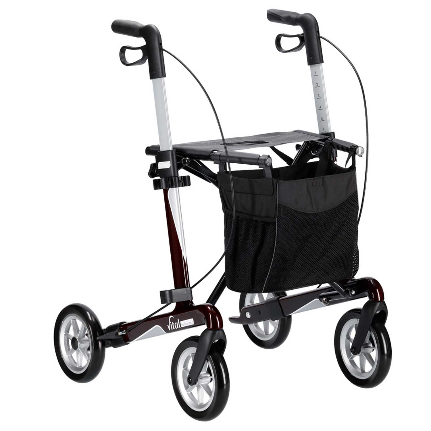 Die weichen, stoßdämpfenden Räder aus Polyurethan sorgen für ein angenehmes Fahrgefühl und gleichen Unebenheiten im Untergrund effektiv aus, was besonders gelenkschonend ist. Der Rollator verfügt über einen einfachen Faltmechanismus mit integrierter, magnetischer Faltsicherung, der ein müheloses Zusammenklappen ermöglicht. Im gefalteten Zustand beträgt die Breite nur 24 cm, was den Transport und die Lagerung vereinfacht. Die optimierte Taschenhalterung dient gleichzeitig als Tragegriff, sodass der gefaltete Rollator bequem getragen werden kann.