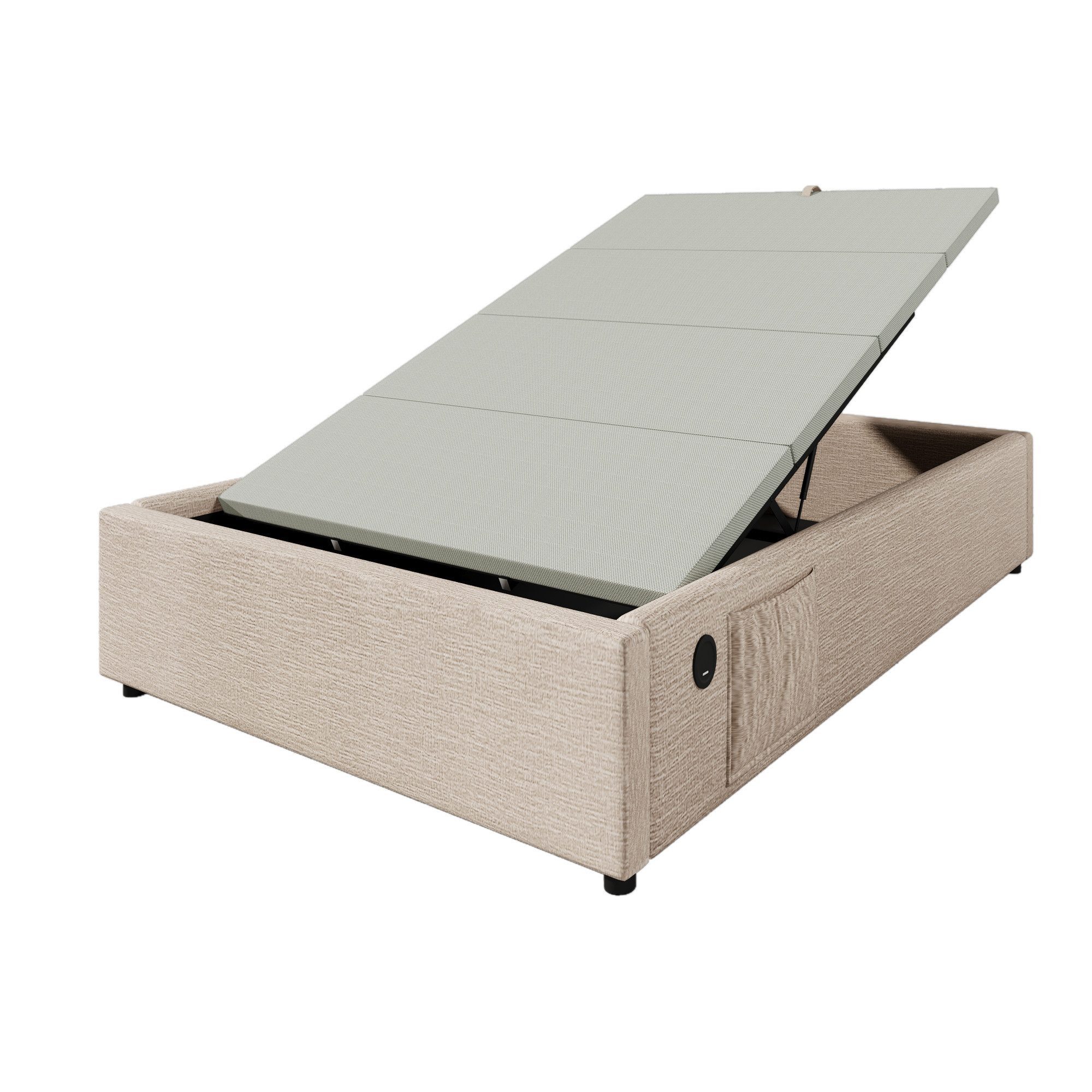 Das Bett verfügt über integrierte Ladeanschlüsse, die es ermöglichen, elektronische Geräte jederzeit bequem aufzuladen. Eine Seitentasche am Bett eignet sich perfekt zur Aufbewahrung von Kopfhörern, Ladekabeln und anderen kleinen Gegenständen, sodass Sie den Komfort moderner Technologie auch im Bett genießen können.
