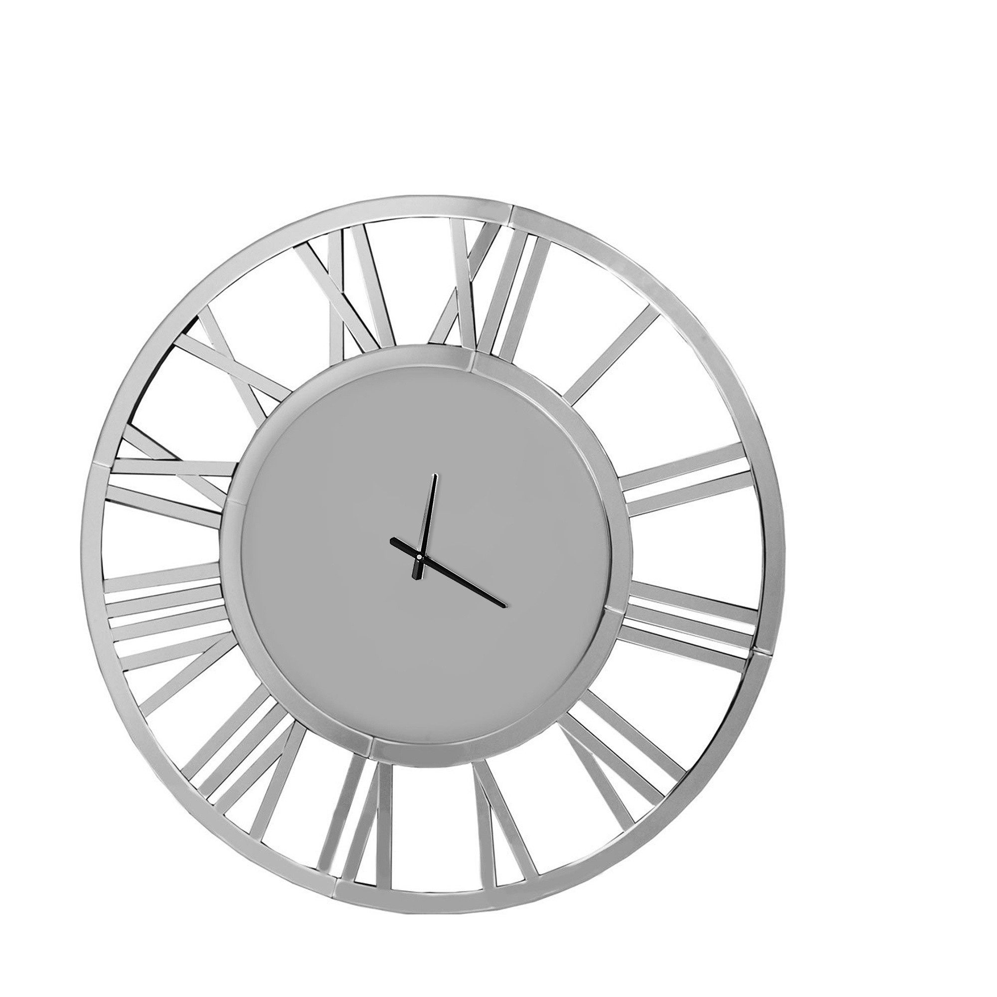Die gesamte dekorative Wanduhr hat ein minimalistisches Design mit einem silbernen Spiegel auf der Oberfläche, das Zifferblatt ist durch einen speziellen römischen Ziffernrahmen ersetzt und nur Minuten- und Stundenzeiger ticken nicht. Diese Spiegeluhr für Wohnzimmerdekor erzeugt ein außergewöhnlich klares Bild mit geringem Verzug.