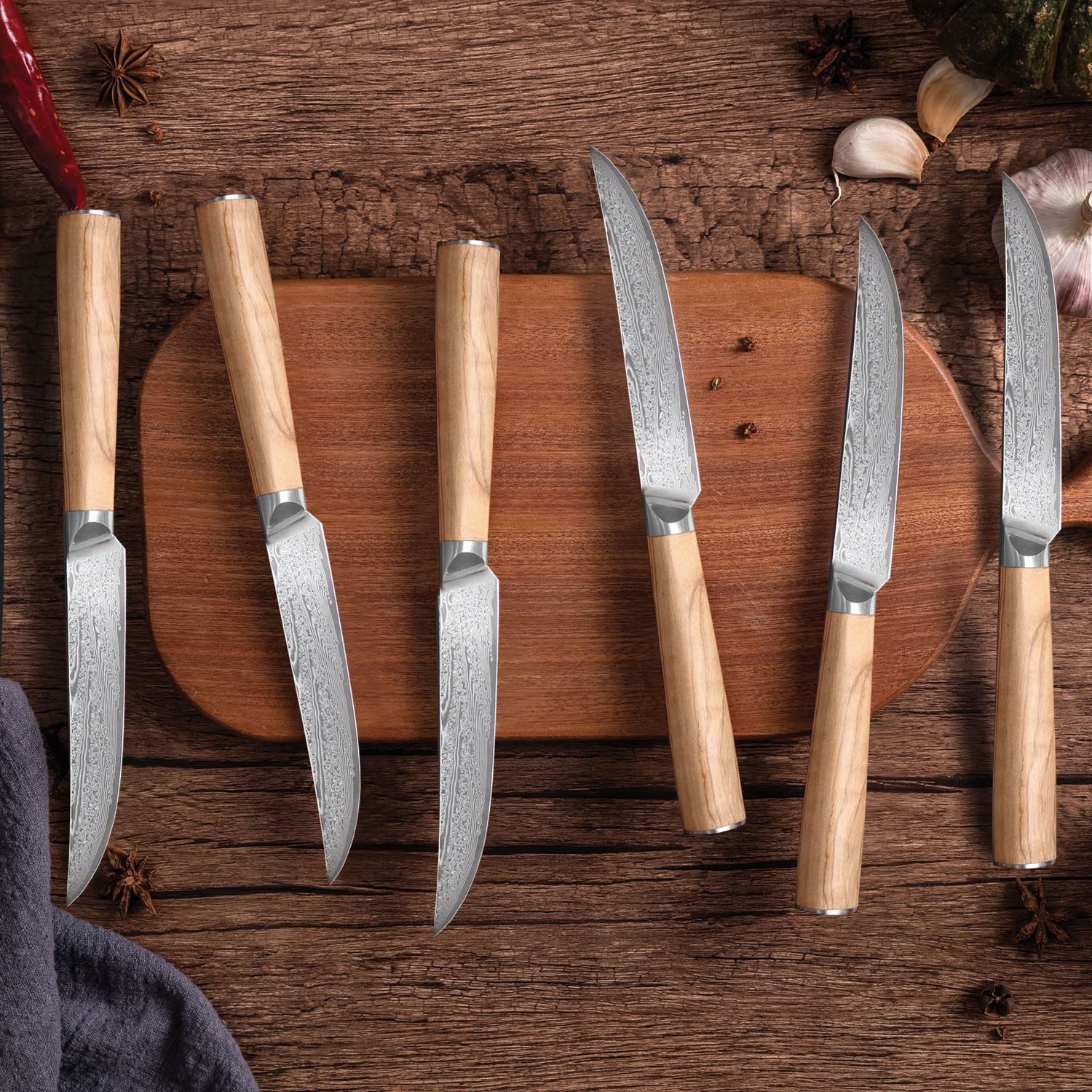 Damast-Steakmessern mit Olivenholzgriff 6er Set von Ryoma