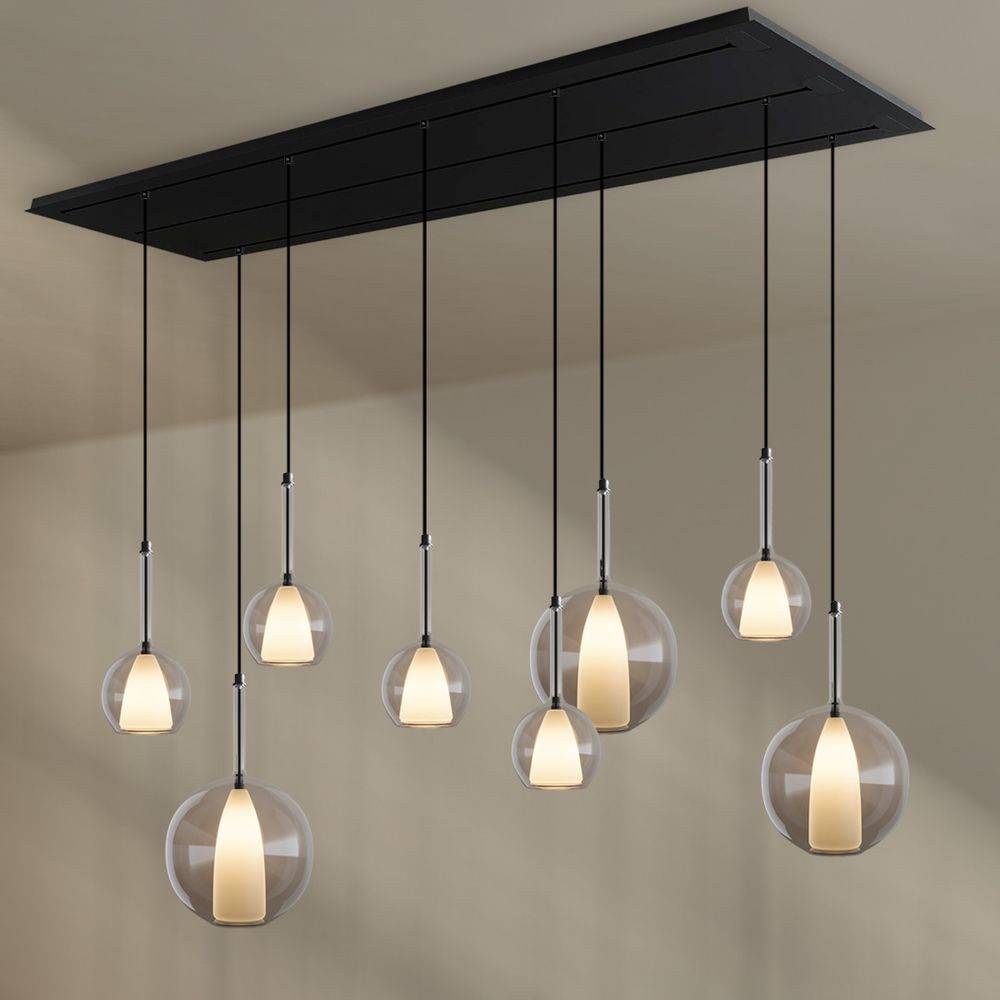 Die Leuchten sind auf einem hochwertigen, 200 cm langen Metall-Baldachin montiert, der eine klare, lineare Anordnung ermöglicht – ideal für lange Tischflächen oder Inselanlagen. Die Kabellänge von 150 cm (individuell kürzbar) passt sich flexibel an Raumhöhen bis ca. 300 cm an. Zwei wählbare Glasgrößen (Ø 14 cm und Ø 24 cm) erlauben kreative Kombinationen.