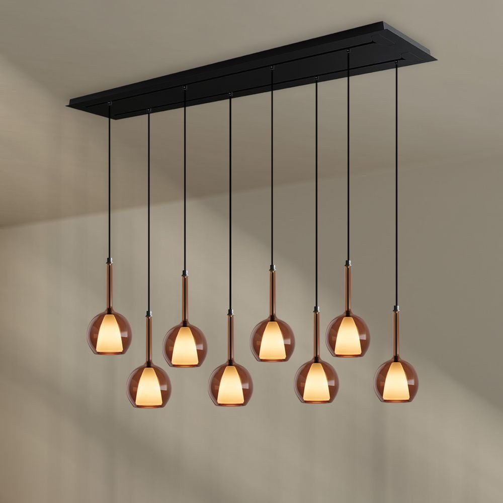 Die s.luce Belluna Esstischleuchte 8-flammig bringt stilvolle Eleganz und angenehmes Licht direkt über deinen Esstisch oder deine Kücheninsel. Acht Pendel aus mundgeblasenem Glas – wahlweise in klar, Cognac oder Rauchglas – schaffen ein raffiniertes Lichtspiel mit weicher, blendfreier Ausstrahlung, dank des opalfarbenen Innenglases in jedem Element.
