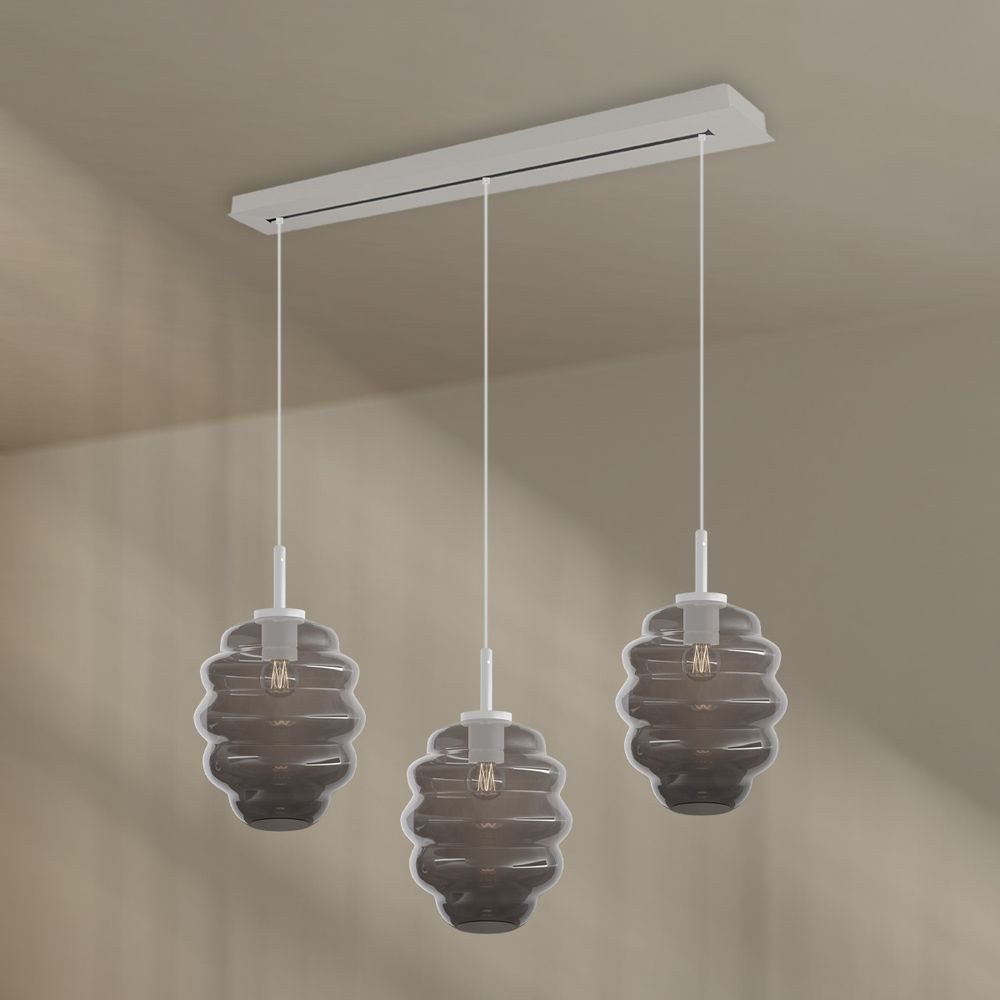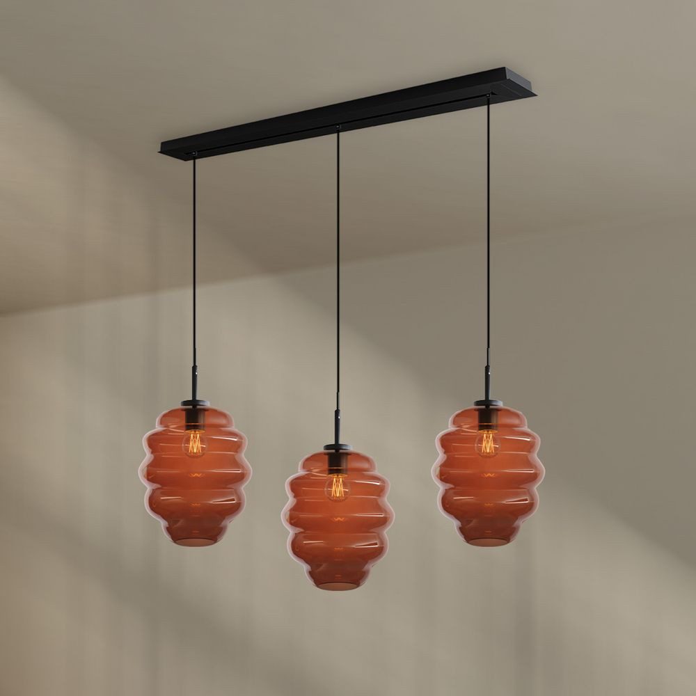 Drei mundgeblasene Gläser mit strukturierter Oberfläche reflektieren das Licht auf lebendige Weise und sorgen für eine warme, wohnliche Atmosphäre. Die Farbtöne Braun (Cognac), Rauch und Klar lassen sich frei kombinieren, wodurch sich sowohl harmonische als auch kontrastreiche Gestaltungen realisieren lassen.