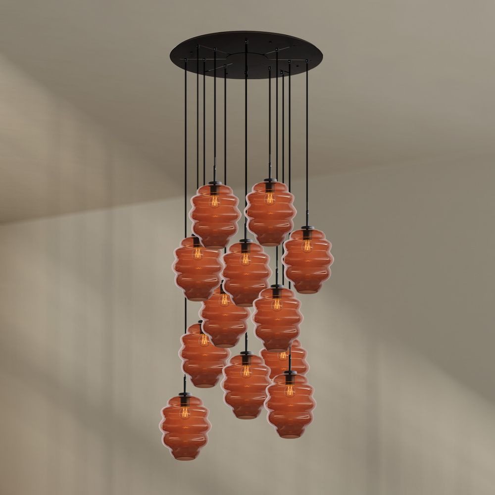 Die s.luce Echos Galerieleuchte 12-flammig ist eine eindrucksvolle Design-Pendelleuchte mit hochwertig mundgeblasenen Glaskörpern in 25 cm Durchmesser. Inspiriert von der wellenförmigen Ausbreitung eines Echos erinnern ihre strukturierten Gläser an Wasserbewegungen – elegant, organisch, einzigartig. Die Gläser sind in den Farben Braun (Cognac), Rauch und Klar kombinierbar und machen jede Leuchte zu einem individuellen Lichtobjekt.