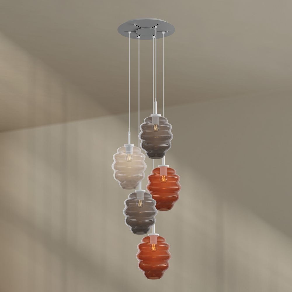 Die s.luce Echos Galerieleuchte 5-flammig mit Ø 60 cm Baldachin und großformatigen Ø 25 cm Glaskörpern bringt elegantes Design und hochwertige Handwerkskunst in perfekte Balance. Sie eignet sich ideal für Lufträume, Treppenhäuser oder offene Bereiche mit großzügiger Deckenhöhe. Fünf strukturierte Gläser aus mundgeblasenem Glas erzeugen ein warmes, lebendiges Lichtbild. Ihre gleichmäßige oder individuell versetzte Anordnung an feinen Seilabhängungen ermöglicht kreative Gestaltungsmöglichkeiten – von symmetrisch bis organisch. Die klar strukturierte Formensprache des runden Baldachins unterstreicht den modernen, leichten Charakter der Leuchte.