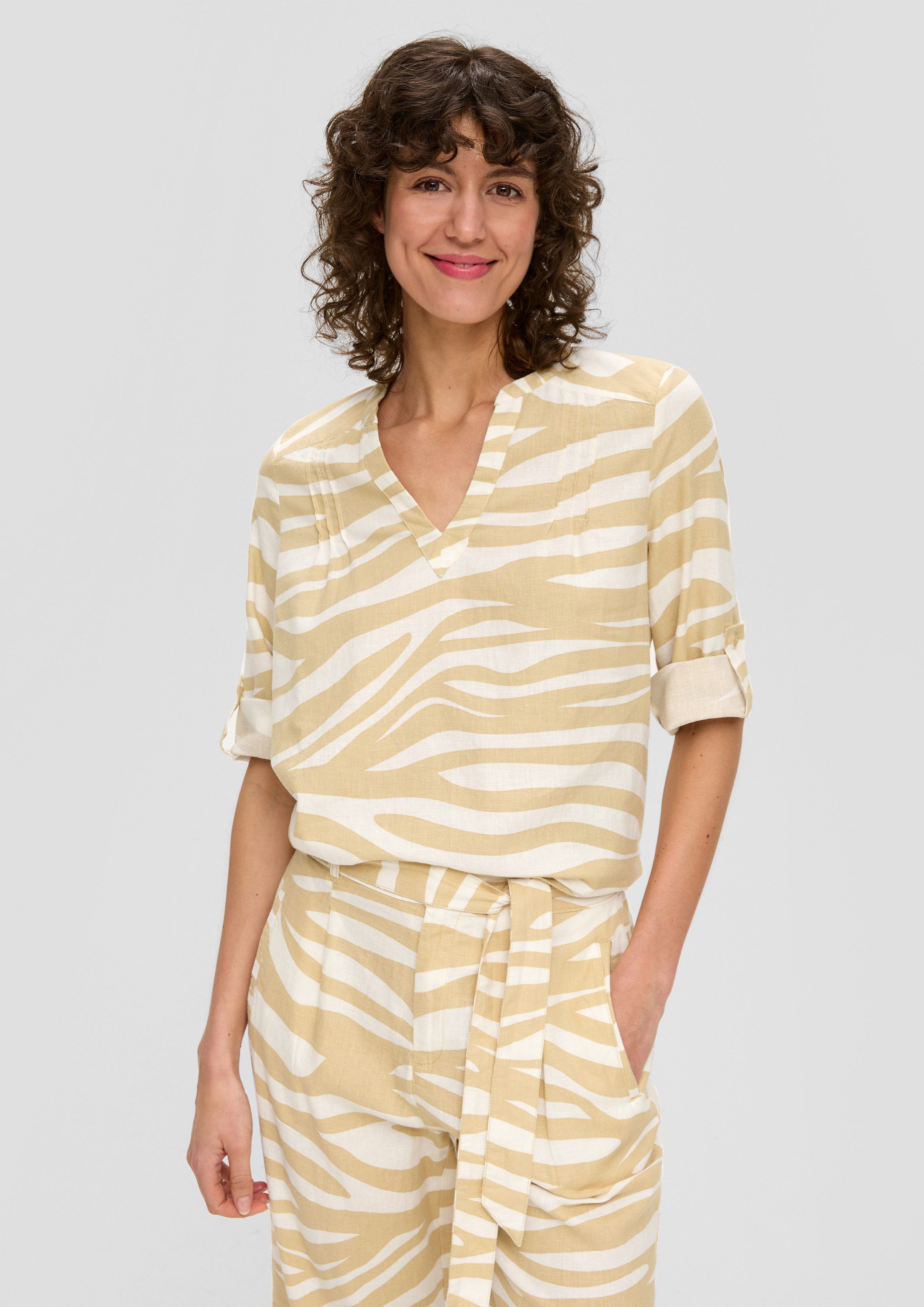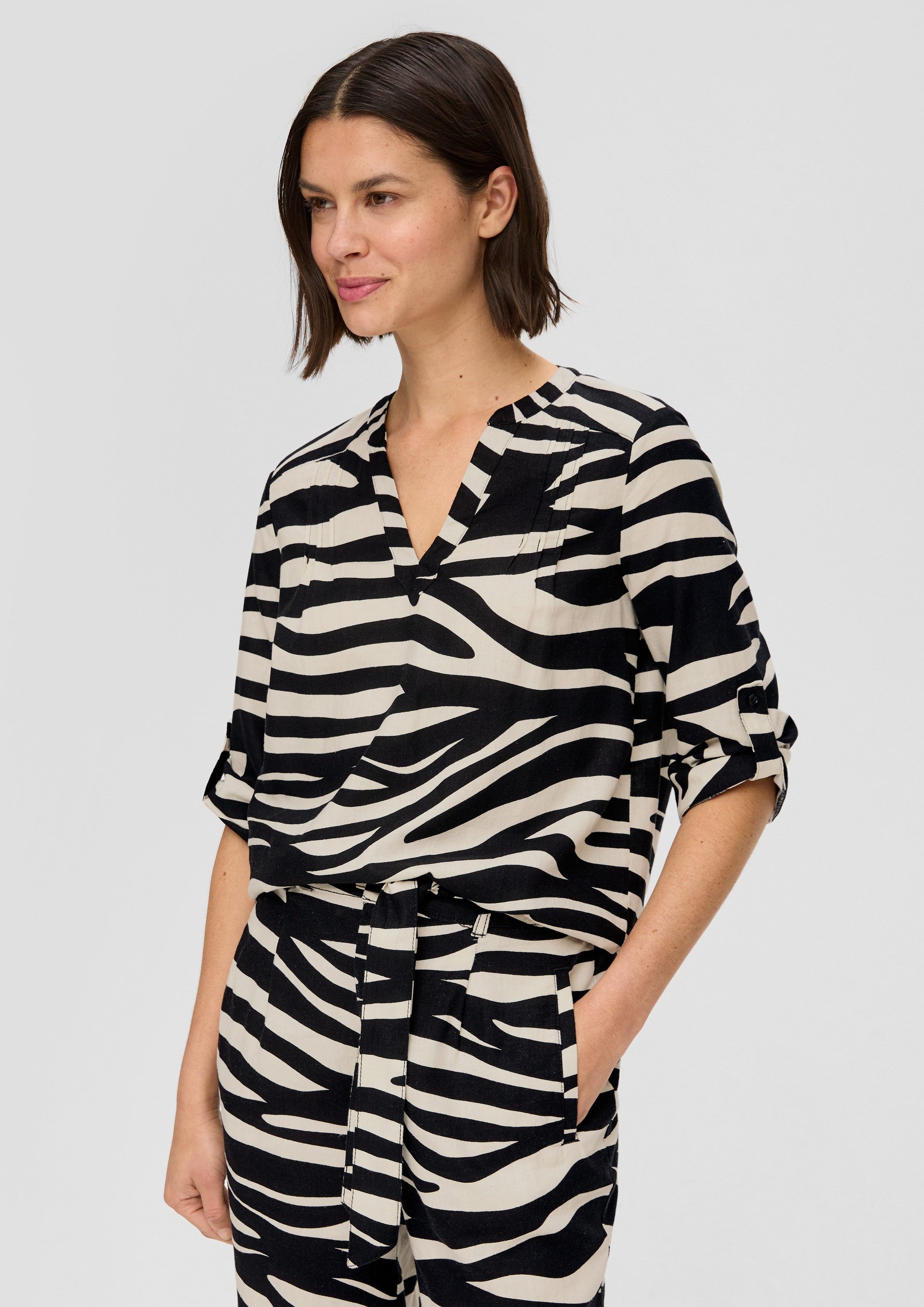 Die Druckbluse von s.Oliver ist sowohl bei schicken Anlässen als auch im Büro eine gute Option. Die 3/4-langen Ärmel sind krempelbar, das heißt du kannst sie stylisch nach oben krempeln, wenn es dir zu warm wird und enden in einer geknöpften Manschette. Diese Bluse hat einen V-Ausschnitt und ist normal sowie komfortabel geschnitten, sodass du einen hohen Tragekomfort hast. Das Oberteil hat einen Vokuhila-Schnitt und ist daher hinten länger geschnitten als vorne.