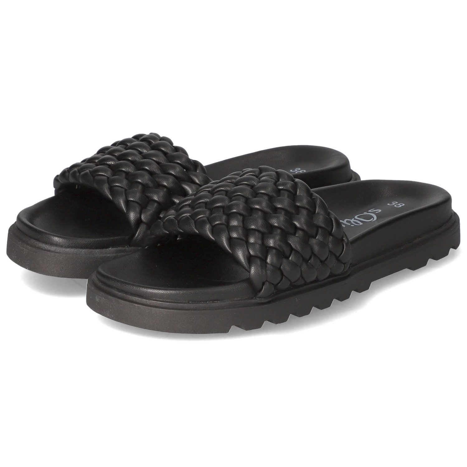 s.Oliver Damen Pantoletten Schwarz Kunstleder - geflochtener Riemen - gepolstertes Tieffußbett - flexible, rutschhemmende Laufsohle mit Profil