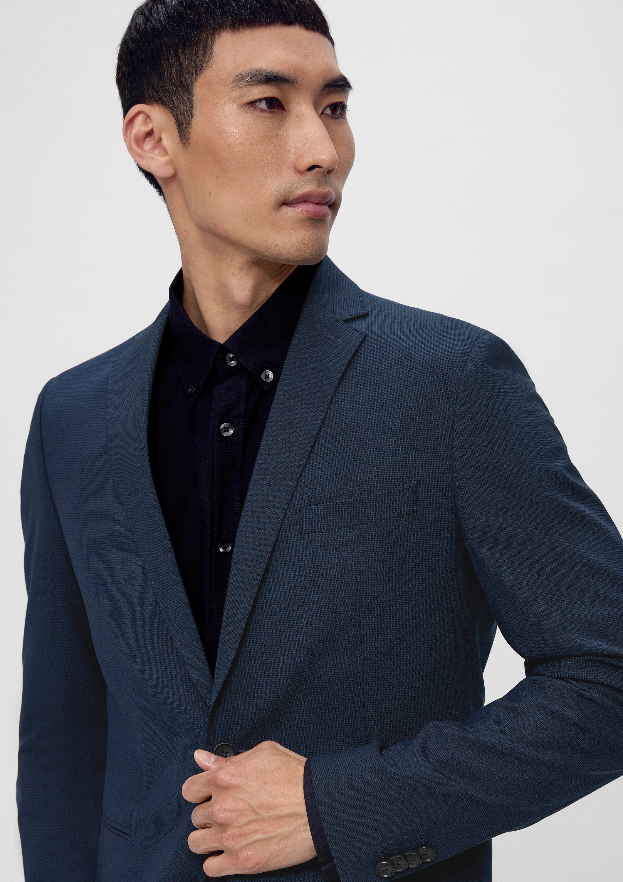 Dieses hochwertige Slim-Fit Sakko aus einem Viskosemix verleiht deinem Business-Look einen modernen Touch. Mit seinem cleanen Look und dem trendigen Reverskragen ist es perfekt für anspruchsvolle Anlässe geeignet. Die lange Ärmel und der seitlich geschlitzte Saum sorgen für eine elegante Silhouette. Der Knopfverschluss und die angedeutete Tasche verleihen dem Sakko einen stilvollen Touch. Das Sakko ist vielseitig kombinierbar und ideal für die bevorstehende Saison. Ergänze deinen Style und betone deine Persönlichkeit mit diesem zeitlosen Piece! Werde zum Trendsetter!