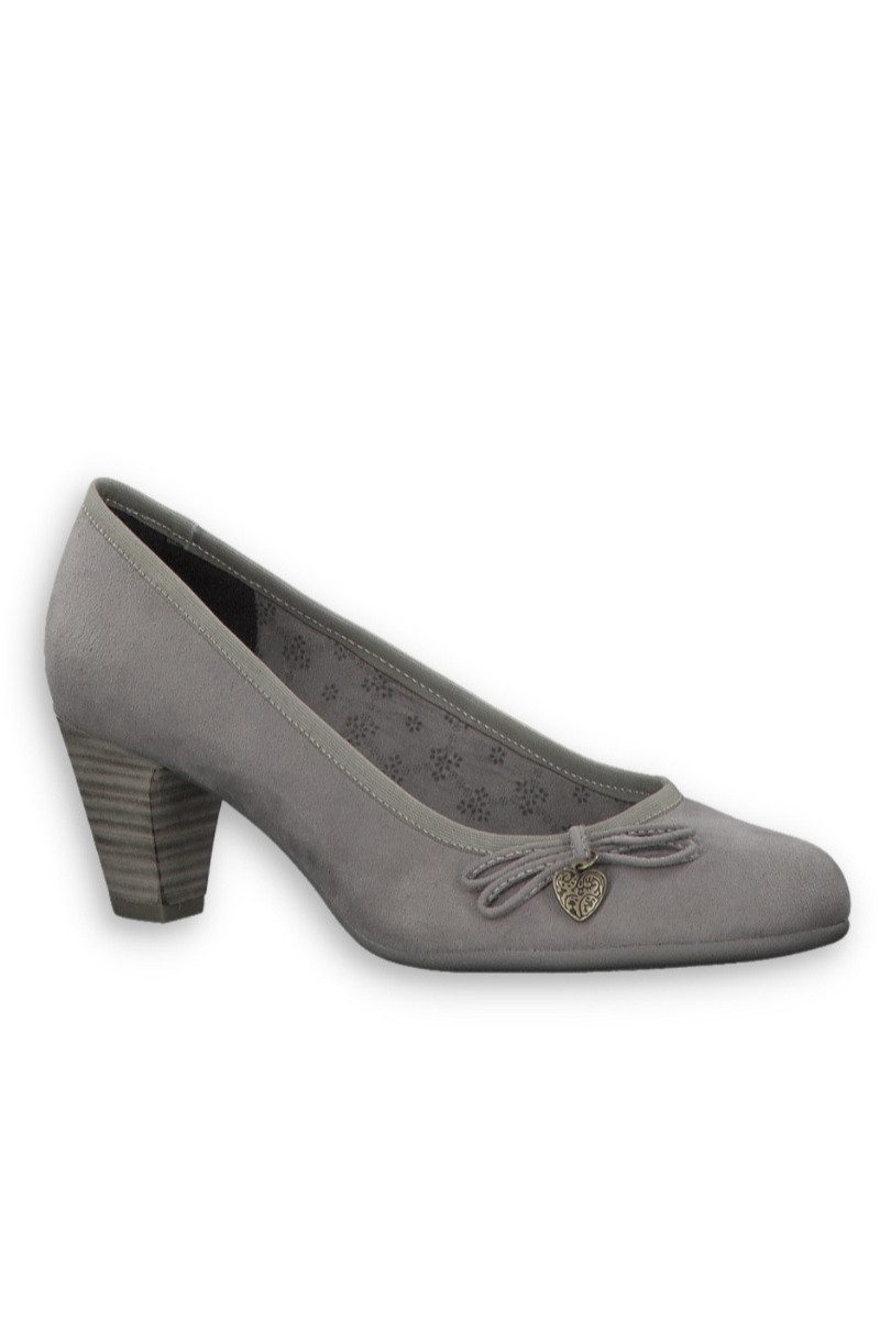 Konrada, die trachtig-eleganten Pumps im samtigem Veloursleder-Stil mit Trichterabsatz, sind eine meisterhafte Kreation von s.Oliver. Der Schuheinstieg ist mit Kontraststoff umsäumt. Vorn außenseitig ziert eine entzückende Schleife aus Velours-Material im Libellenflügel-Stil sowie ein süßer Herz-Anhänger aus Metall mit Ornamentik-Muster den Damenschuh. Das Fußbett ist für einen angenehmen Tragekomfort gepolstert. Der schicke Trichterabsatz im geschichteten Holz-Look gibt den Pumps einen zünftigen Touch. Die Gummisohle vorn hat ein Profil in Korbgeflecht-Optik und die Sohle am Absatz ist fein geriffelt. Diese Damenpumps sind nicht nur passend zur Tracht.
