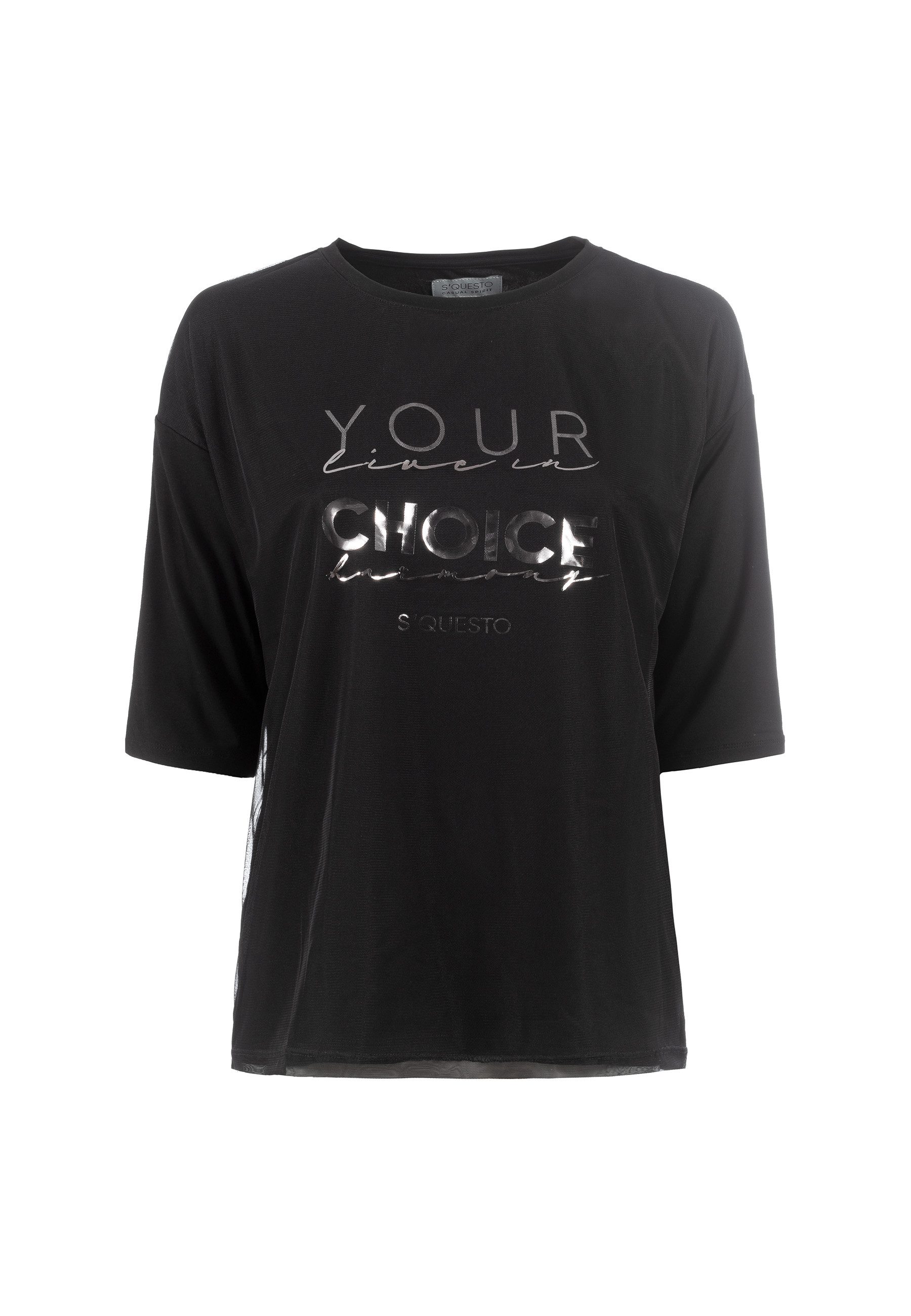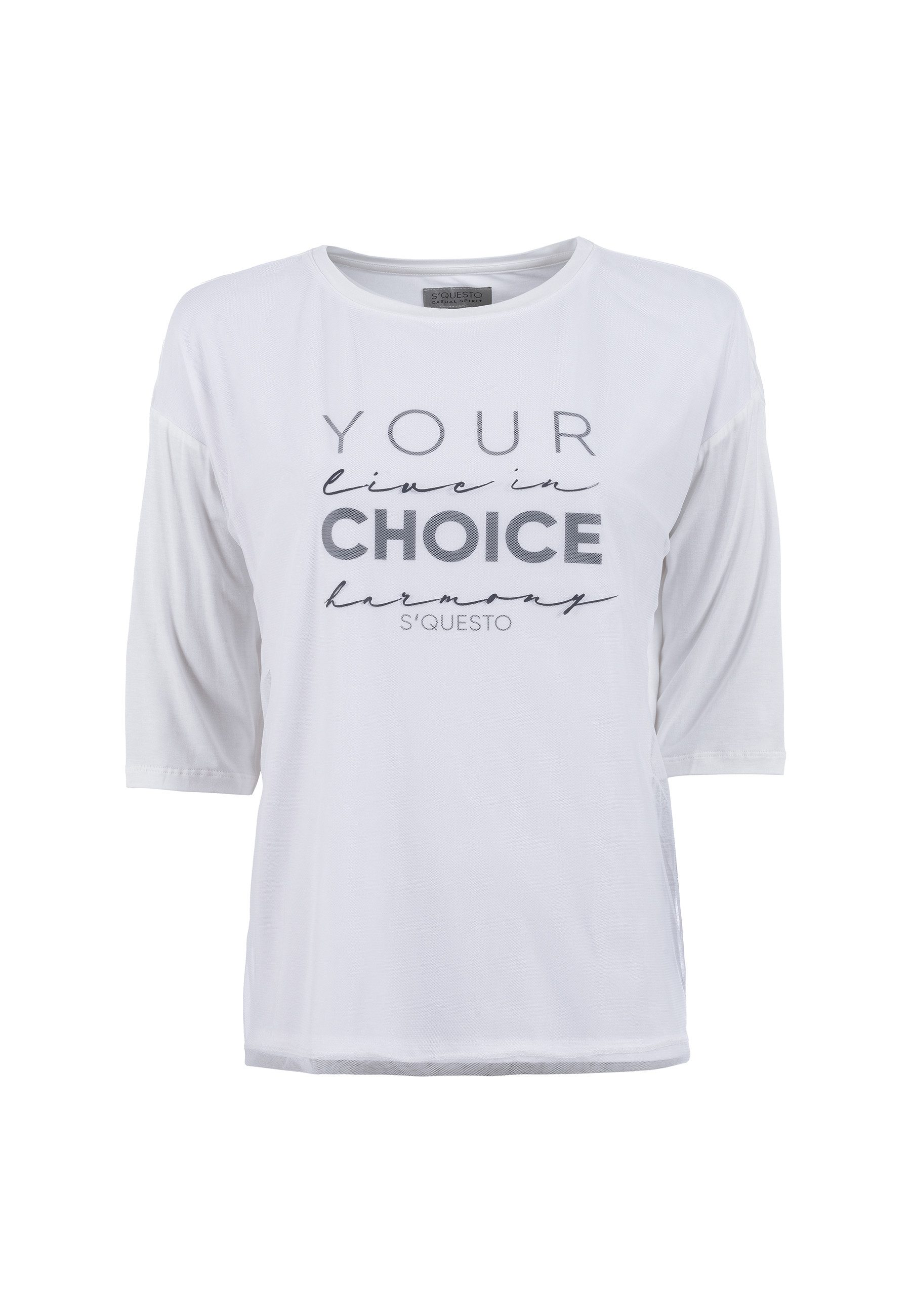 Modisches Shirt mit 3/4-Arm und Rundhalsausschnitt. Das Shirt ist besonders, durch eine Meshlage und einen raffinierten Lettering-Print mit edel glänzenden Elementen. Es ist in Schwarz und in Weiß erhältlich, womit das Shirt vielseitig kombinierbar ist, z.B. mit einem S'questo Blazer.