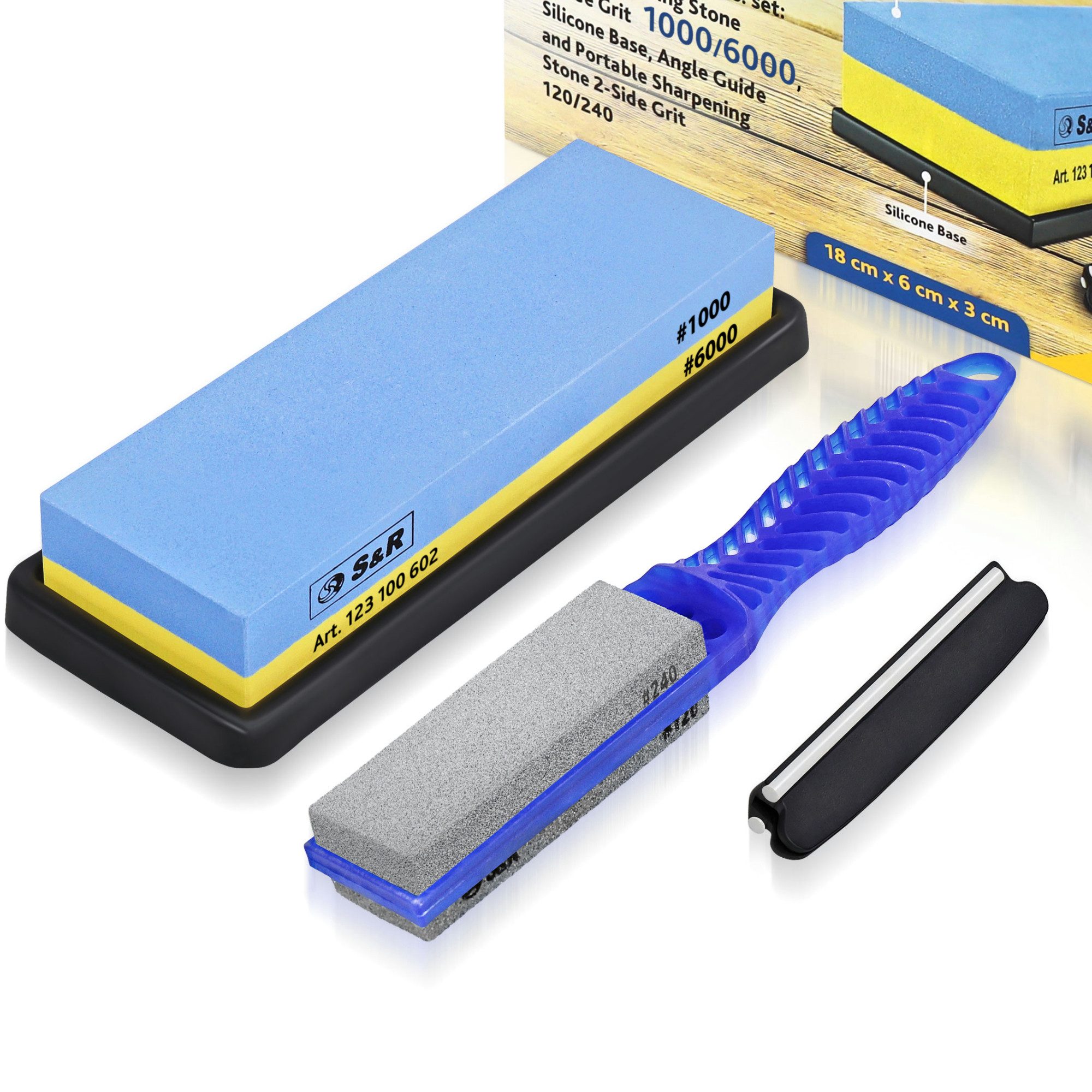 S&R Schlefsteinsatz 4-teilig: Doppelseitiger Schleifstein Körnung 1000/000, Silikonhalter, Winkelführung und tragbarere doppelseitiger Schleifstein Körnung 120/240