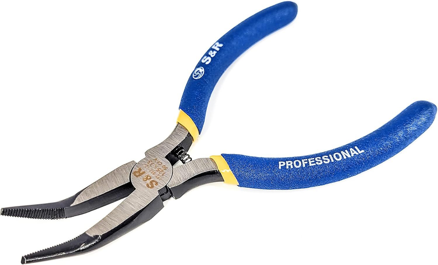 S&R Mini Flachrundzange gebogen 125 x 33 mm, für Elektronik, Feinmechanik, Modellbau, Bastelarbeiten, Radiozange mit Öffnungsfeder, CR-V phosphatiert, doppelt ummantelte Griffe, kompakte Ausführung, Mini Storchschnabelzange