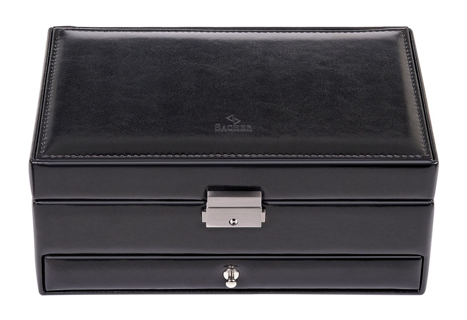 Markeninformationen | Die Schmuckkoffer-Manufaktur Sacher - ein Synonym für hochwertige Qualität! Seit ihrer Gründung im Jahre 1846 steht das inhabergeführte Unternehmen für traditionelle Handwerkskunst und moderne Применитьungstechniken. Die handgefertigten Schmuckkoffer, Uhrenetuis und Maniküren, die du erhältst, werden von erfahrenen Etuimachern hergestellt, die das handwerkliche Können auf höchstem Niveau beherrschen. Die Verwendung von nachhaltigen und wasserlöslichen Klebstoffen sowie die Produktion von Rohkörpern aus Kartonage mit FSC-Siegel unterstreichen das Engagement für Umweltschutz. Darüber hinaus werden ausschließlich edle italienische Leder verarbeitet, was die hochwertige Qualität der Schmuckkoffer, die du erhältst, unterstreicht. Entdecke die exklusive Welt der Schmuckkoffer-Manufaktur Sacher und erlebe den Unterschied hochwertiger Handwerkskunst. |