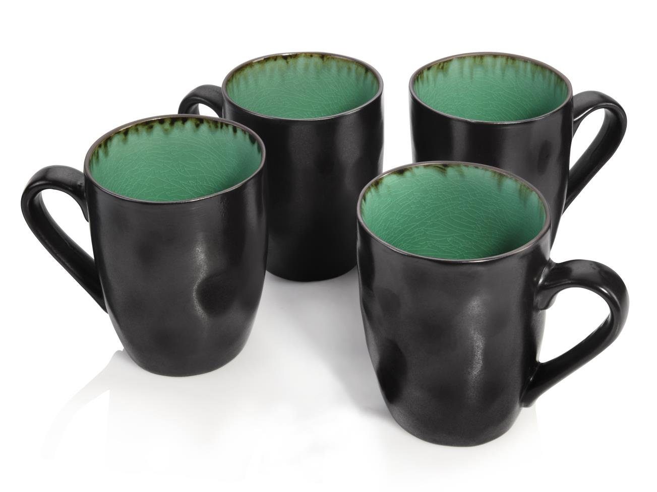 Durch die braunen Ränder sowie die türkisen und krakelierten Nutzflächen entsteht eine einzigartige Harmonie, welche einen unvergleichlichen Eindruck hinterlässt. Der Krakelee-Effekt, auch Reißlack genannt, zieht sich beim Trocknen zusammen, wobei sich ein Muster von Sprüngen bildet. Dieser Effekt gibt den Tassen eine ganz besondere Tiefe und verleiht ihnen eine wundervolle Vintage Note.