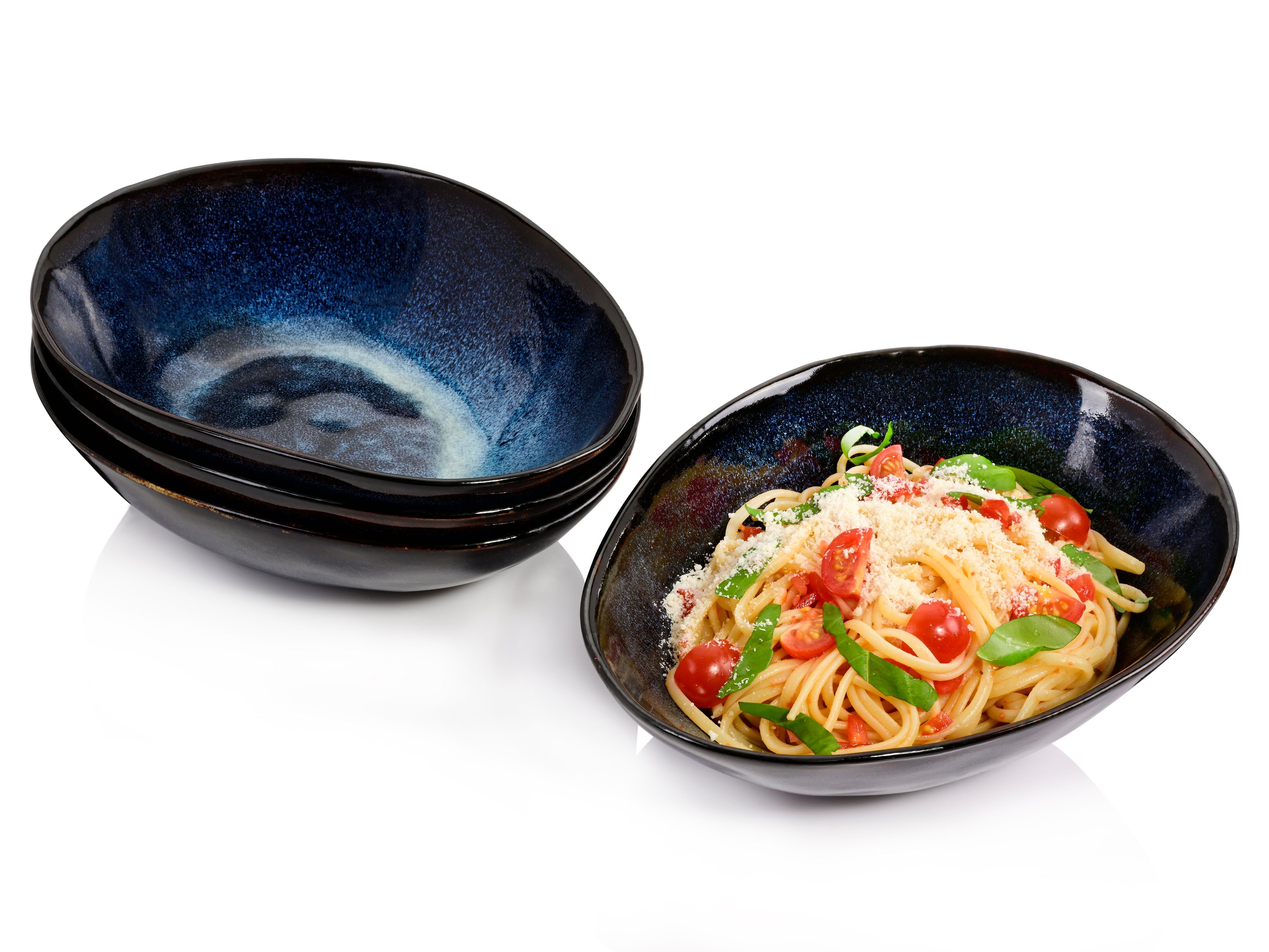 Unser Steingut Geschirr ist für seine rustikale Schönheit bekannt. Entdecken Sie die Schönheit der einzigartigen blauschwarzen Pastaschale mit braunen Akzenten. Das Material ist mikrowellen- und spülmaschinengeeignet.