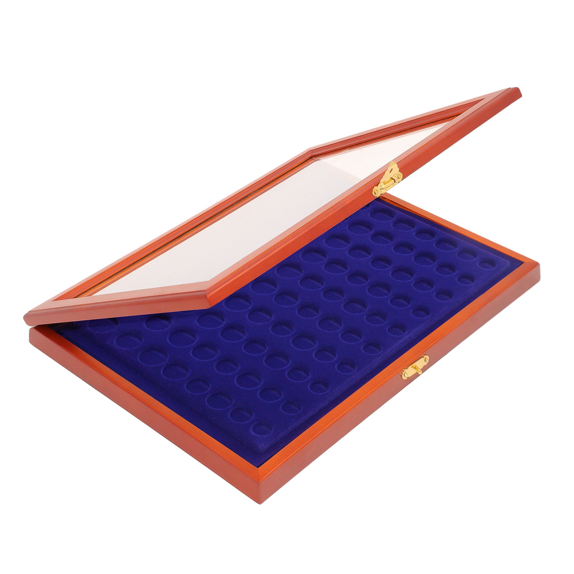 Der Holzrahmen mit Echtglas-Einsatz schützt Ihre Sammlung zuverlässig und ermöglicht gleichzeitig eine elegante Präsentation. Die königsblaue Samteinlage verfügt über speziell gestaltete runde Vertiefungen, die die Münzen sicher an ihrem Platz halten – selbst bei Wandmontage.