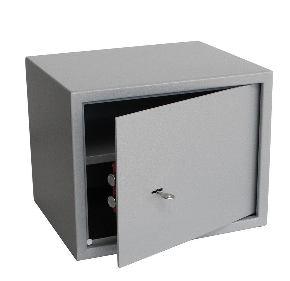 Die Tresore sind in 3 Größen erhältlich und solide aus Stahl gebaut. Die Wandungen bestehen aus 2 mm-, die Türe aus 4 mm-dickem Stahl. 2 solide Stahlbolzen schließen die Türen. Der Verschluss erfolgt entweder per Schlüssel, Zahlenschloss oder Fingerprint.