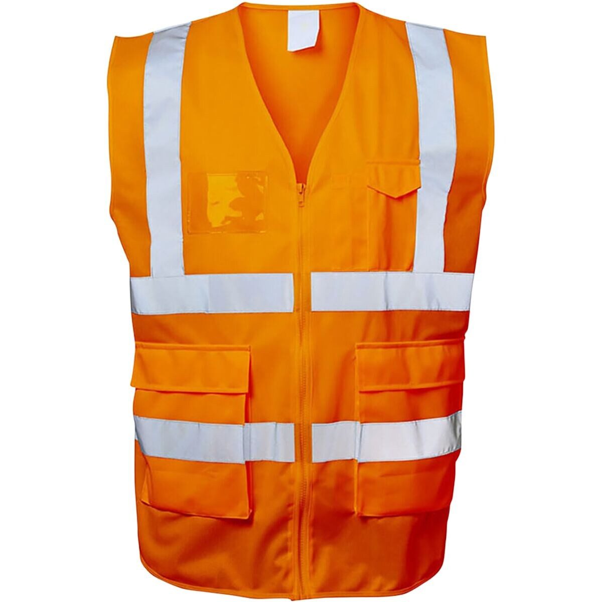 Warnschutzweste »BASIC« Klasse 2 Размер XL, locker geschnittene und robuste Weste in Signalfarben mit Reflexstreifen für sicheres Arbeiten im Freien bei dunklen Verhältnissen, mit praktischer Ausweistasche, Ausstattung: 2 Seitentaschen mit Patte und Reißverschluss zur Unterbringung von Werkzeug und Zubehör, 1 Brusttasche mit Handytasche und Stiftefach, 1 transparente Ausweistasche auf Brusthöhe, gute Sichtbarkeit dank breiten Reflexstreifen um Rumpf und Schultern, durchgehender Frontreißverschluss, Material: 100% Polyester, Warnschutzklasse: 2, Größe: XL
