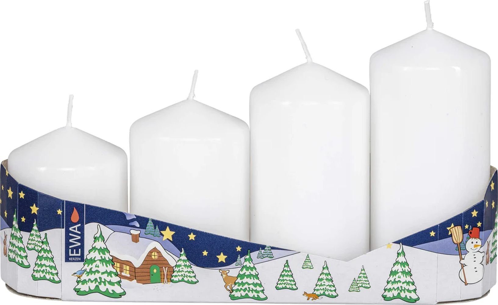 Wachskerzen Stumpenkerzen 4er-Pack weiß Stumpenkerzen in weiß mit einer Abstufung in ihrer Размер sind ideal um den Adventskranz zu ergänzen. Die Kerzen haben einen Durchmesser von 5 Zentimetern und eine Höhe von 6,5 / 8 / 9,5 / 11 cm Höhe ca. Höhe von 6,5 / 8 / 9,5 / 11cmcm NEU |