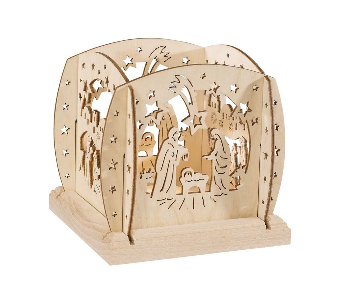 Laterne "Christi Geburt" Teelicht natur Diese Teelichthalter in Laubsägeoptik mit Motiven der Christi Geburt sind ein besonderer Hingucker. Mit den Abmessungen von 12 x 12 x 12cm passen Sie überall gut hin. Er ist auch gleichzeitig Windschutz und bieten Platz für ein Teelicht. Gefertigt werden die Teelichthalter im Erzgebirge aus hochwertigem Holz und so werden Sie lange Freude an diesen haben BxHxT 12x12x12cm NEU |