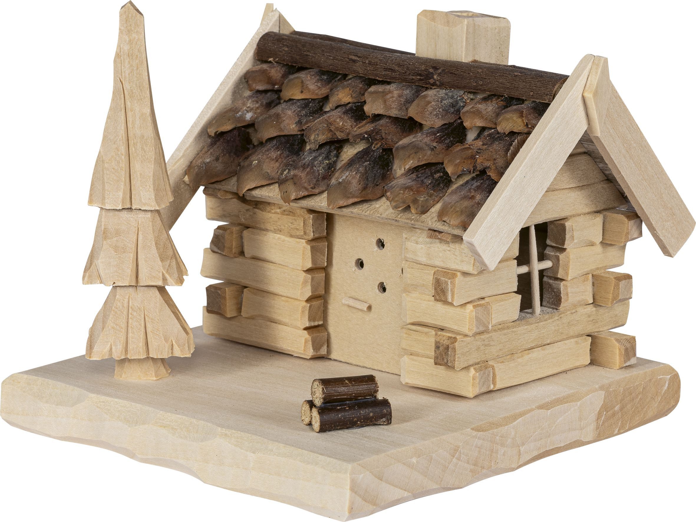 Räucherhaus Waldhütte Dieses tolle Räucherhaus hat eine Размер von 11 cm. Das Haus steht frei auf einem Sockel und hat eine Funktion für normale Räucherkerzen. Es ist vollständig aus Holz gefertigt und natur gestaltet. Das Unterteil mit dem Boden lässt sich abnehmen und darauf wird die Räucherkerze gestellt. Всеs wird in verschiedenen Arbeitsschritten komplett im Erzgebirge hergestellt. BxHxT 13x11x13cm NEU |