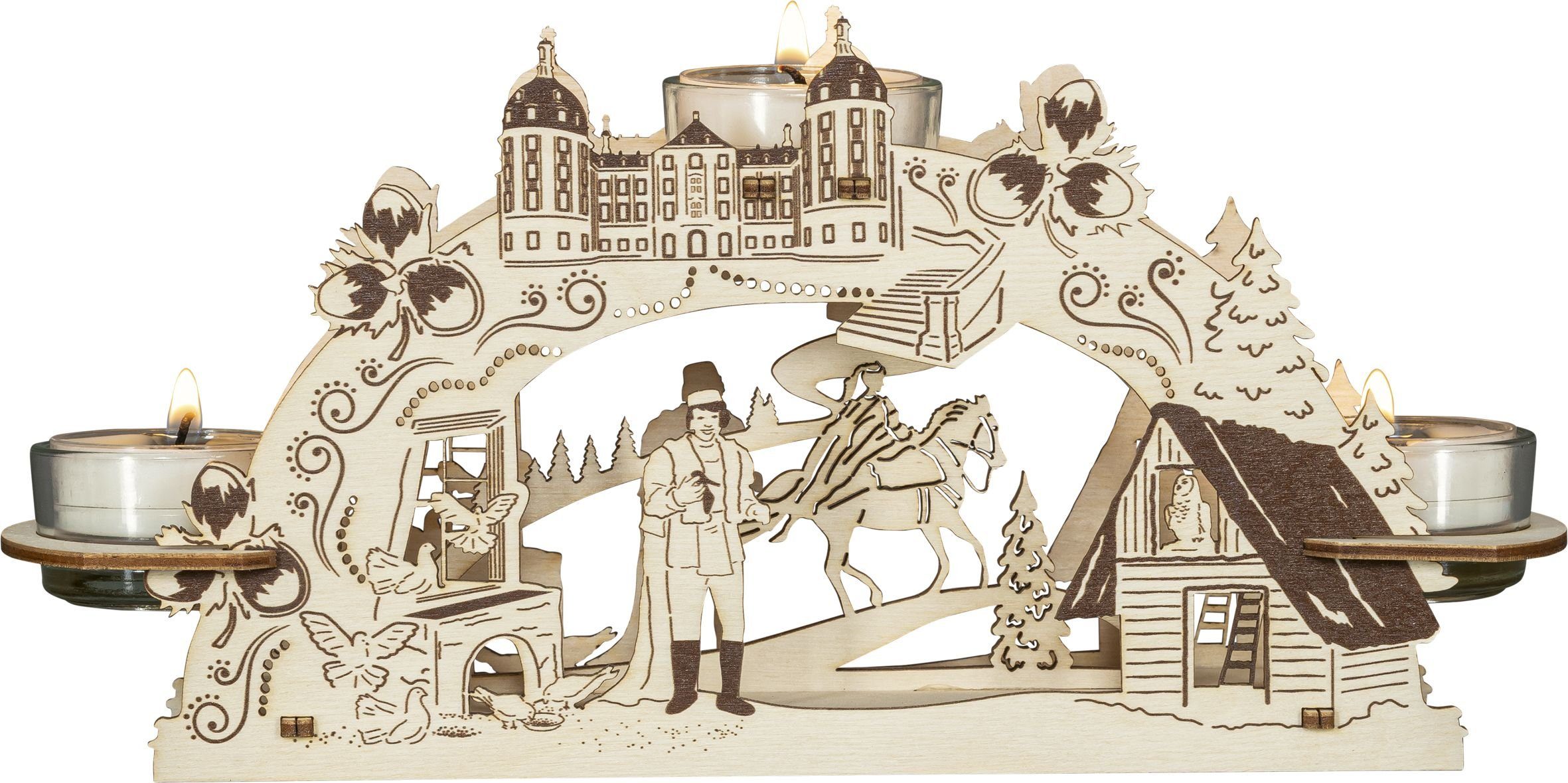 Teelichthalter Drei Haselnüsse für Aschenbrödel ® 3 Teelichter Mit dem märchenhaften Motiv von "Drei Haselnüsse für Aschenbrödel®", bringen sie Glanz in ihr Zuhause. Dieser Leuchter, ist farbig abgesetzt und bietet platz für 3 Teelichter. Passend zum Märchen, bietet der Leuchter einige feine Details, sowieso die Figur des Prinzen und Aschenbrödel. Verziert mit feinen Elementen wie den Haselnüssen an der Blende des Leuchter und dem Schloss Moritzburg ist der Leuchter ein echtes Highlight. Hergestellt im Erzgebirge ist dieser Leuchter, eine wunderschöne Ergänzung ihrer Dekoration in der Advents- und Weihnachtszeit. Durch die hohe Qualität und das langlebige Material werden unsere Kunden sehr lange Freude daran haben oder einem geliebten Menschen ein schönes Geschenk an Weihnachten machen. Der Leuchter aus Holz kann, statt mit echten Teelichtern natürlich auch mit LED-Teelichtern betrieben werden. Dann eignet er sich auch als Deko fürs Kinderzimmer. BxHxT 24x11,5x6,5cm NEU |
