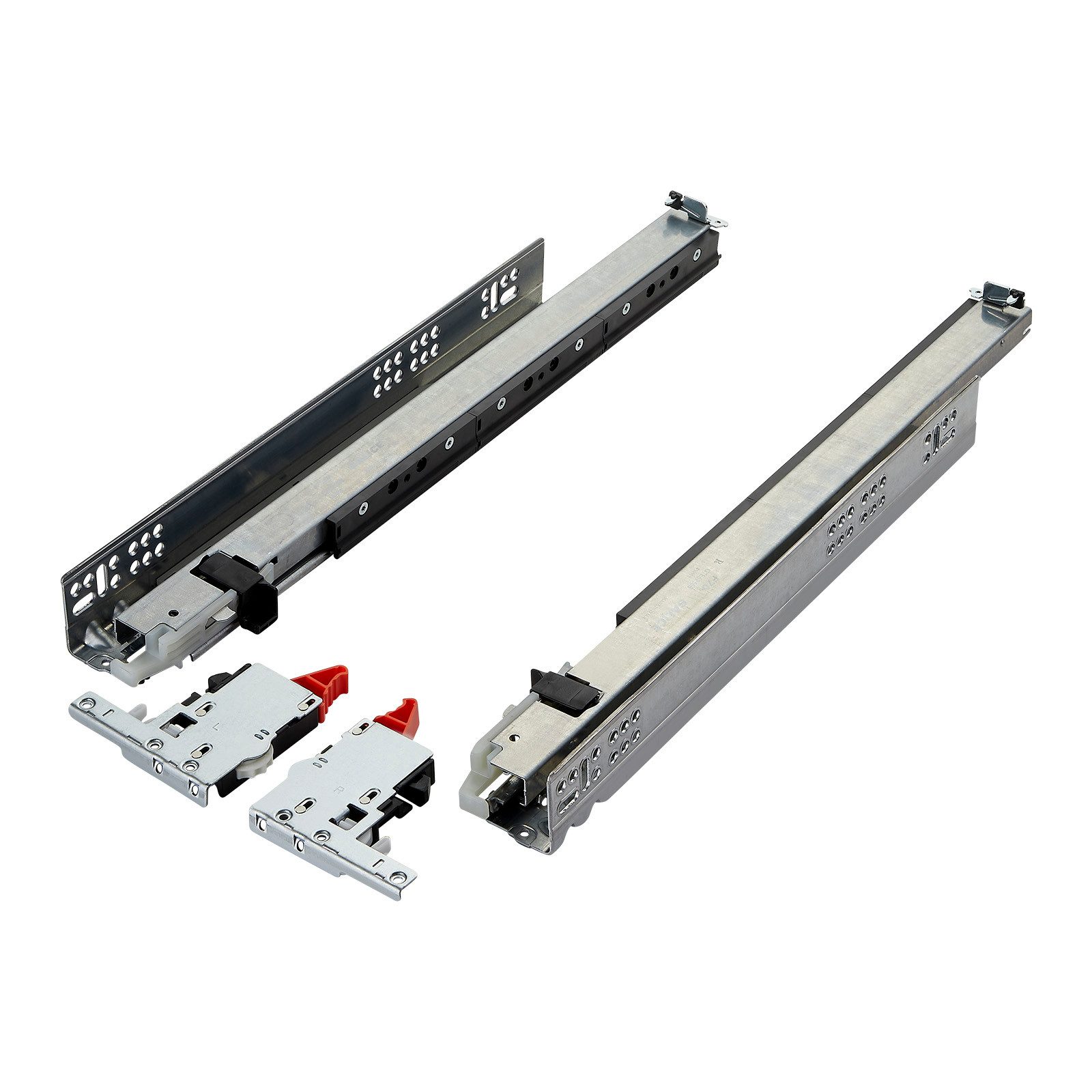 Vorteile auf einen Blick: Vollauszug für maximalen Komfort. Mit synchronisierter Bewegung „S-Drive“. Hohe Belastbarkeit: Dynamische Tragkraft bis zu 70 kg. Integriertes Push-Öffnungssystem: Grifflose Fronten werden durch kurzes antippen geöffnet. Die Schublade bleibt im geschlossenen Zustand verriegelt. Innovative Montageclips Clip 3D (Kupplung): Einfaches Einhaken und Demontage der Schublade. Schnelle und intuitive Justierung in drei Richtungen. Für Schubladen mit Seitenstärke bis 16 mm. Oberfläche: Zink Silber