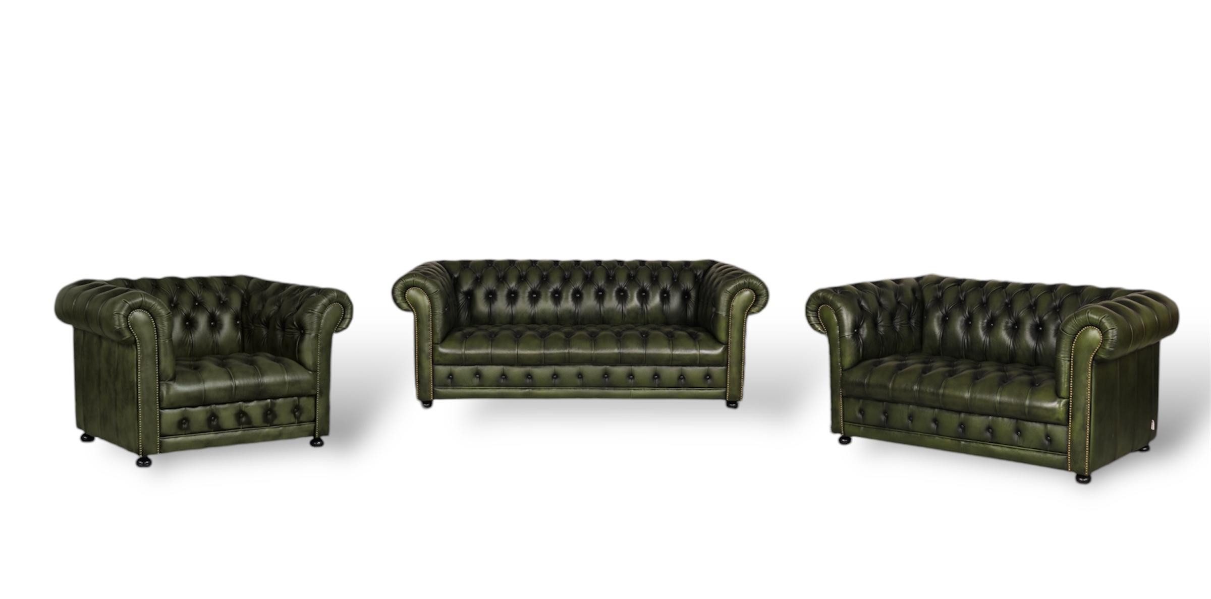 Massives Hartholz-Innengestell. Все Stellen sind mit italienischem Top Grain Rindsleder bezogen. Diese Sofagarnitur wird für eine Langlebigkeit und einen tollen Sitzkomfort mit einem Nosagfederkern und einer angenehmen Schaumstoffpolsterung ausgestattet. Der Sitzkomfort ist perfekt abgestimmt, dieser ist nicht zu weich und nicht zu hart. Die Füße und der Rahmen sind aus Hartholz. Die Nägel in der Front der Sofas werden einzeln von Hand eingeschlagen. Es handelt sich nicht nur um eine Zierleiste. Edle Chesterfield Sofagarnitur mit einer traumhaften Optik. Die Möbelstücke dieser Garnitur haben folgende Gewichte: Das 3er Sofa wiegt 64 kg, das 2er Sofa 56 kg und der Sessel 35 kg! Also absolut langlebige massive Möbel.