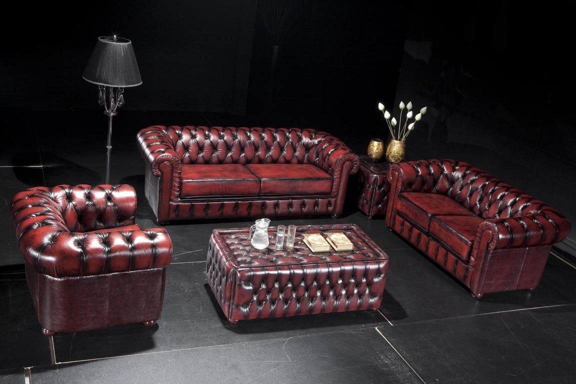 Die Chesterfield Sofagarnitur Modell Bolton inklusive dem edlen Ledertisch besticht neben seinen ausgewogenen Proportionen durch seine gemütliche Polsterung (Taschenfederkerne) und sorgfältig gearbeitete Details. Die einzeln von Hand angebrachten Lederknöpfe adeln diese klassische Sofagarnitur zu einem luxuriösem Schmuckstück. Eine echte Handwerkskunst!