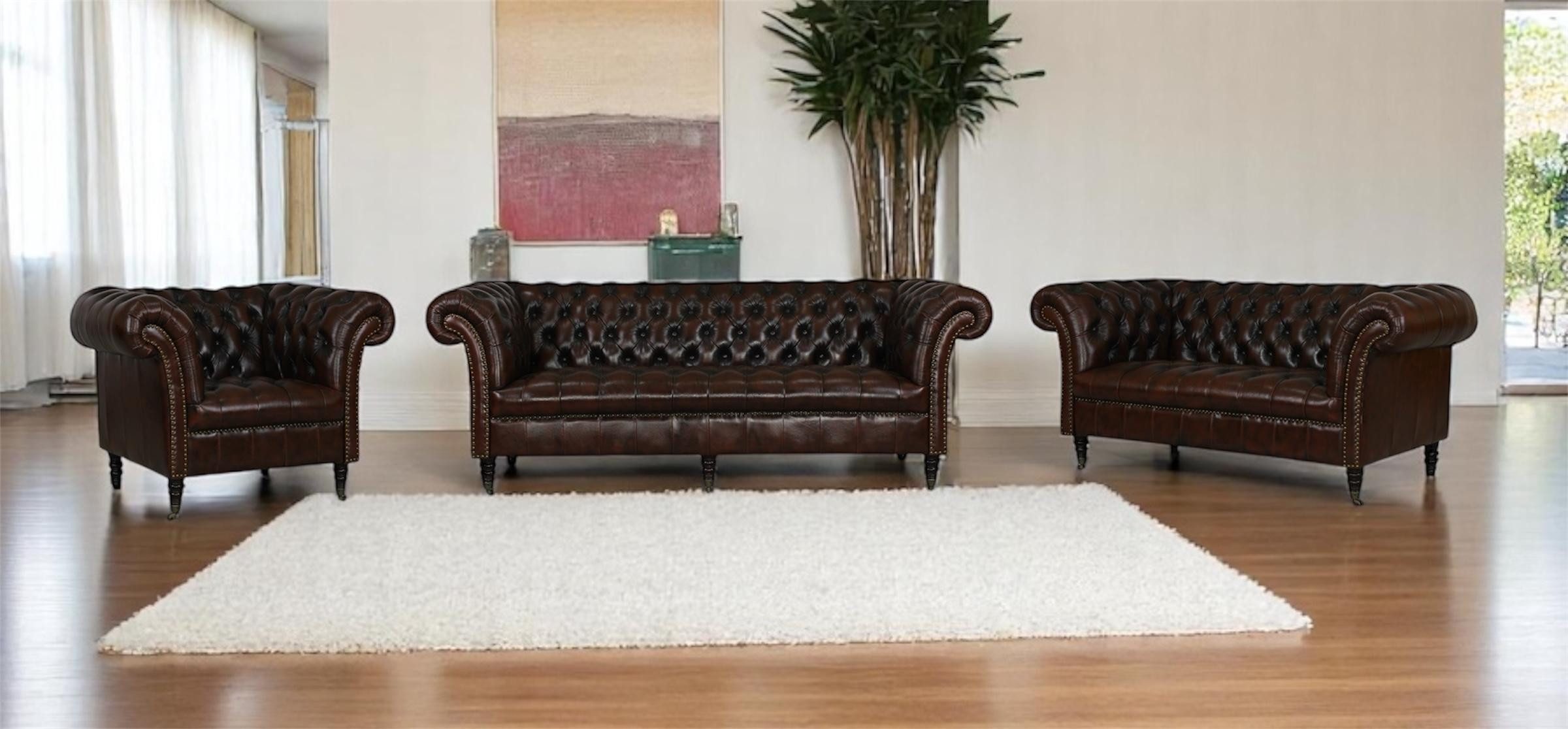 Massives Hartholz-Innengestell. Все Stellen sind mit italienischem Top Grain Rindsleder bezogen. Diese Sofagarnitur wird für eine Langlebigkeit und einen tollen Sitzkomfort mit einem Nosagfederkern und einer angenehmen Schaumstoffpolsterung ausgestattet. Der Sitzkomfort ist perfekt abgestimmt, dieser ist nicht zu weich und nicht zu hart. Die Füße und der Rahmen sind aus Hartholz. Die Nägel in der Front der Sofas werden einzeln von Hand eingeschlagen. Es handelt sich nicht nur um eine Zierleiste. Edle Chesterfield Sofagarnitur mit einer traumhaften Optik. Die Möbelstücke dieser Garnitur haben folgende Gewichte: Das 3er Sofa wiegt 62 kg, das 2er Sofa 50 kg und der Sessel 35 kg! Also absolut langlebige massive Möbel in Vollleder!