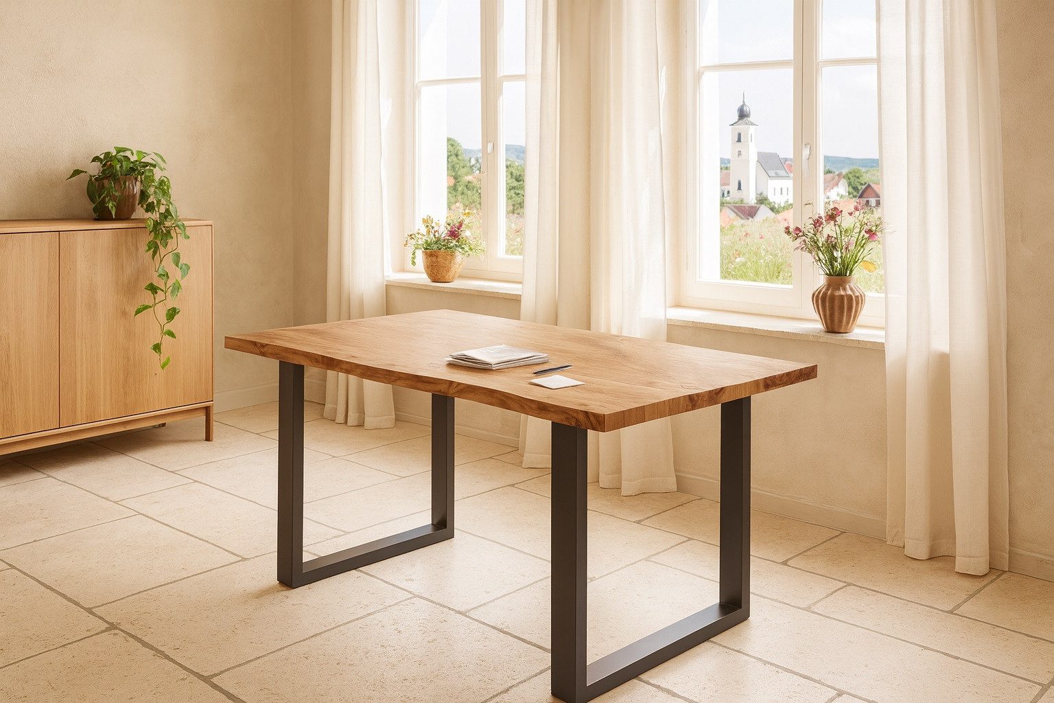 Vom Frühstückstrubel bis zum Sonntagskuchen: Der Baumkantentisch Heiko ist Dein zuverlässiger Begleiter für alle Lebenslagen. Die massive Tischplatte aus lackiertem Akazienholz bringt Wärme und Charakter in Dein Zuhause, während das außergewöhnliche U-Gestell aus schwarzem Metall für Stabilität und ein markantes Design sorgt. Mit seiner natürlichen Baumkante ist dieser Esszimmertisch nicht nur praktisch, sondern auch ein echtes Highlight für Deinen Alltag.