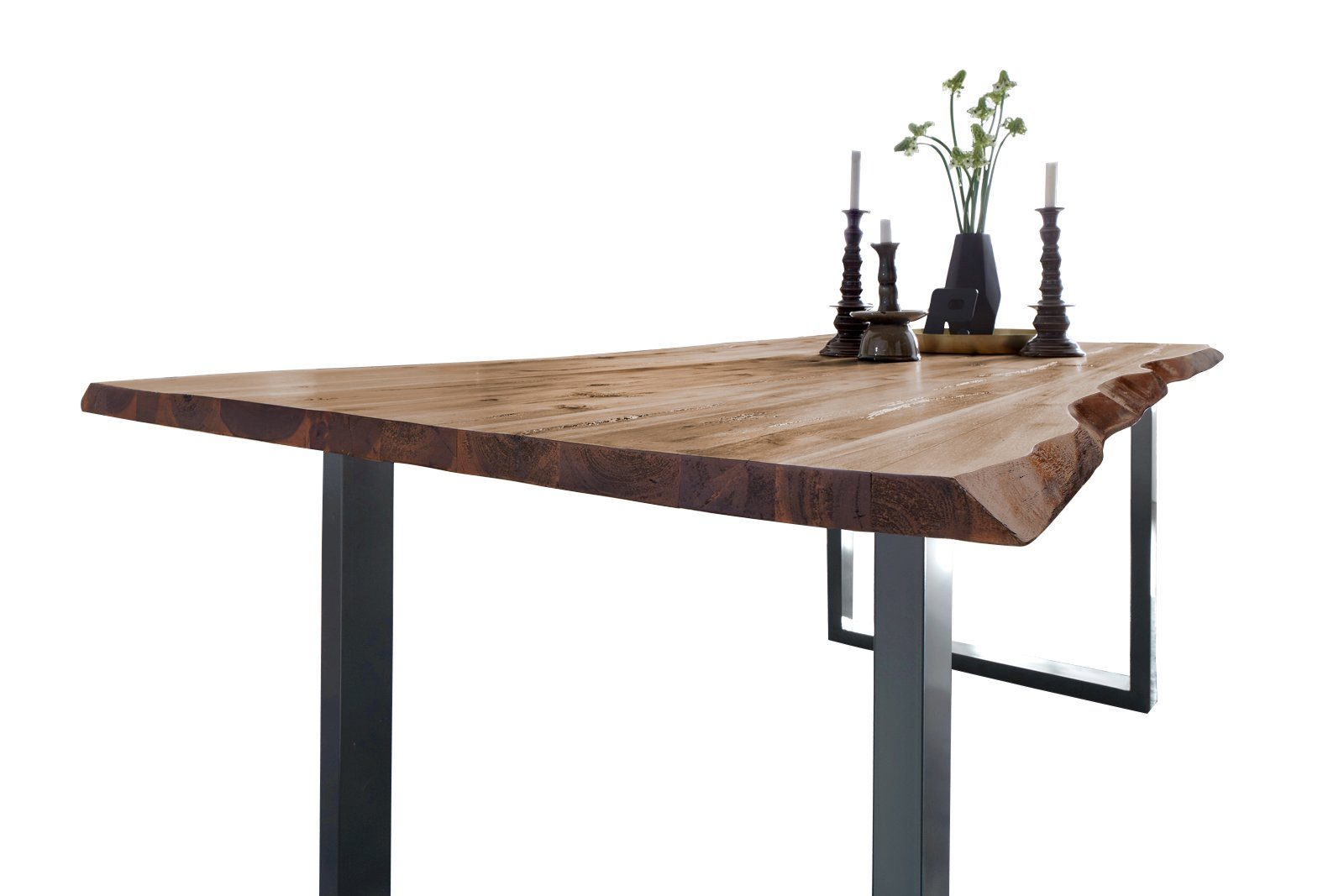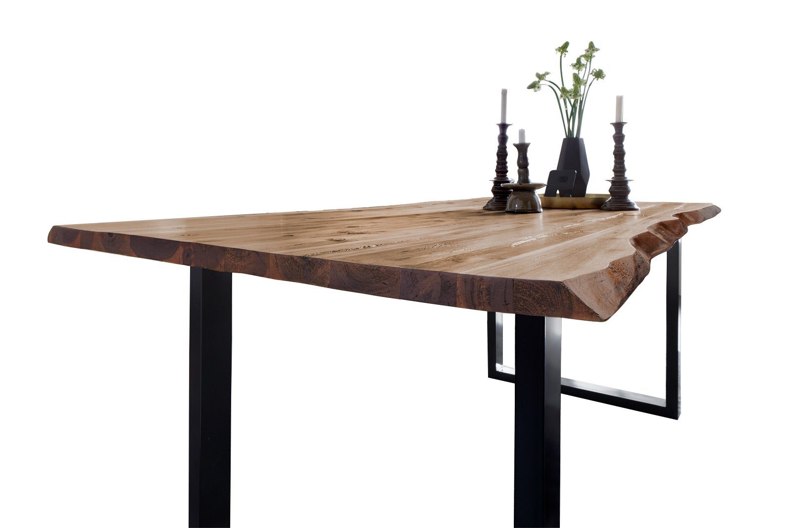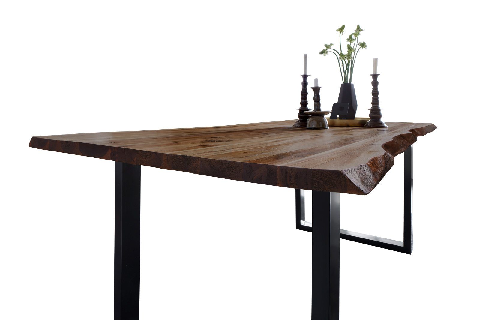 Die Tischkanten wurden aus dem Baumstamm herausgeschnitten und sind exakt so beibehalten, wie der Baum einmal gewachsen ist. Die Beine aus Metall sind ein besonderes Highlight. Denn das elegante U-Gestell aus hochwertigem Roheisen setzt gezielte Akzente im Industrial-Design. Durch diese Kombination wirkt der Tisch sowohl gemütlich rustikal als auch modern und fügt sich perfekt in jedes Ambiente ein.