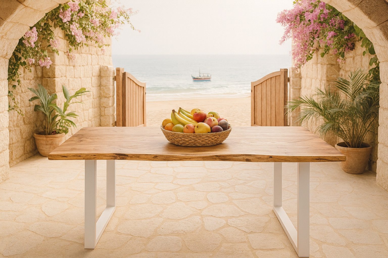 Der Esstisch White_Beach besteht aus einer Massivholztischplatte mit Baumkante und einem eleganten Tischgestell. Massivholz ist belastbar und wohnlich zugleich und passt in nahezu jeden Einrichtungsstil.