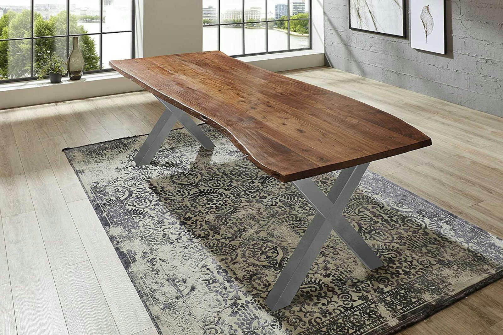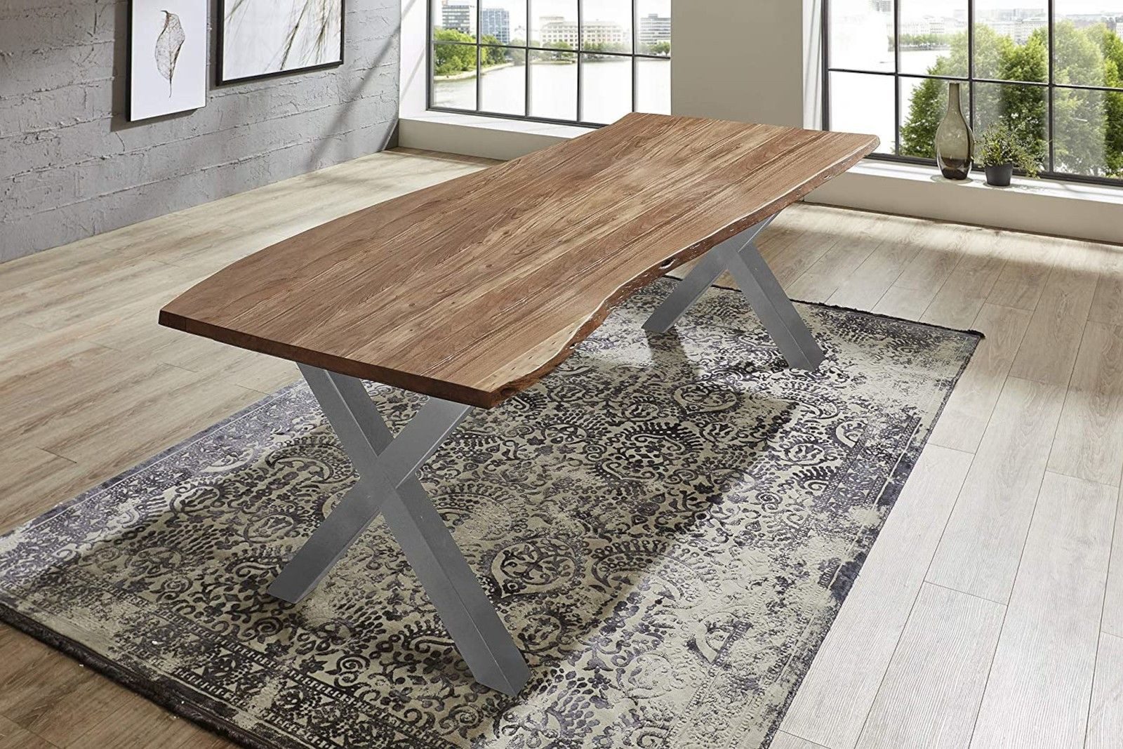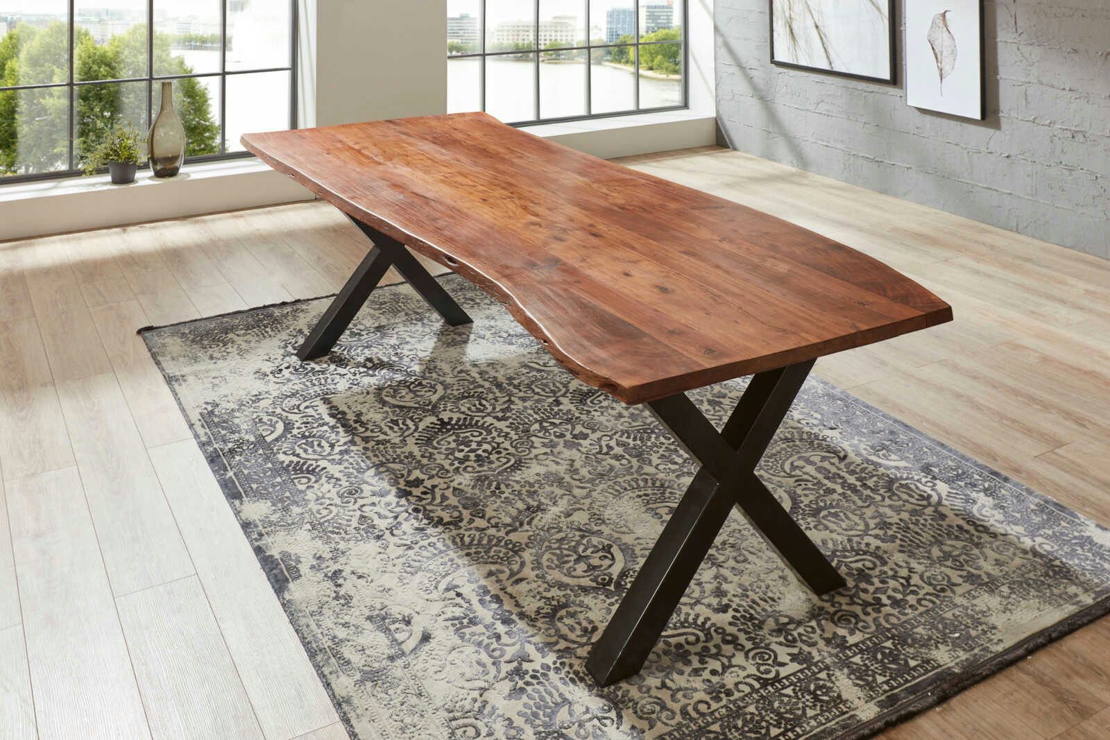 Hochwertiger Esszimmertisch Argos in der Размер 120x80cm – Akazienholz massiv & nussbaumfarben, echte Baumkante, X-Gestell schwarz