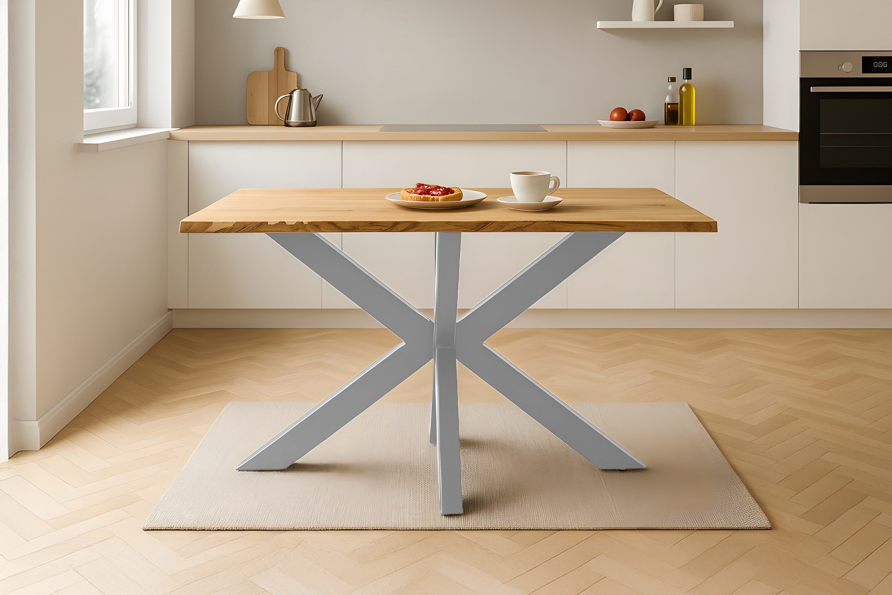 Cata ist ein echtes Allround-Talent im Alltag. Die 120 x 80 cm große Tischplatte aus massivem Eichenholz bringt Stabilität und ein behagliches Wohngefühl mit sich. Dank der natürlichen Baumkanten-Optik wirkt der Tisch besonders lebendig – als würde ein Stück Natur bei Dir einziehen. Das moderne Spider-Gestell aus schwarzem Metall sorgt für optischen Kontrast und einen sicheren Stand – auch wenn’s mal turbulenter zugeht.