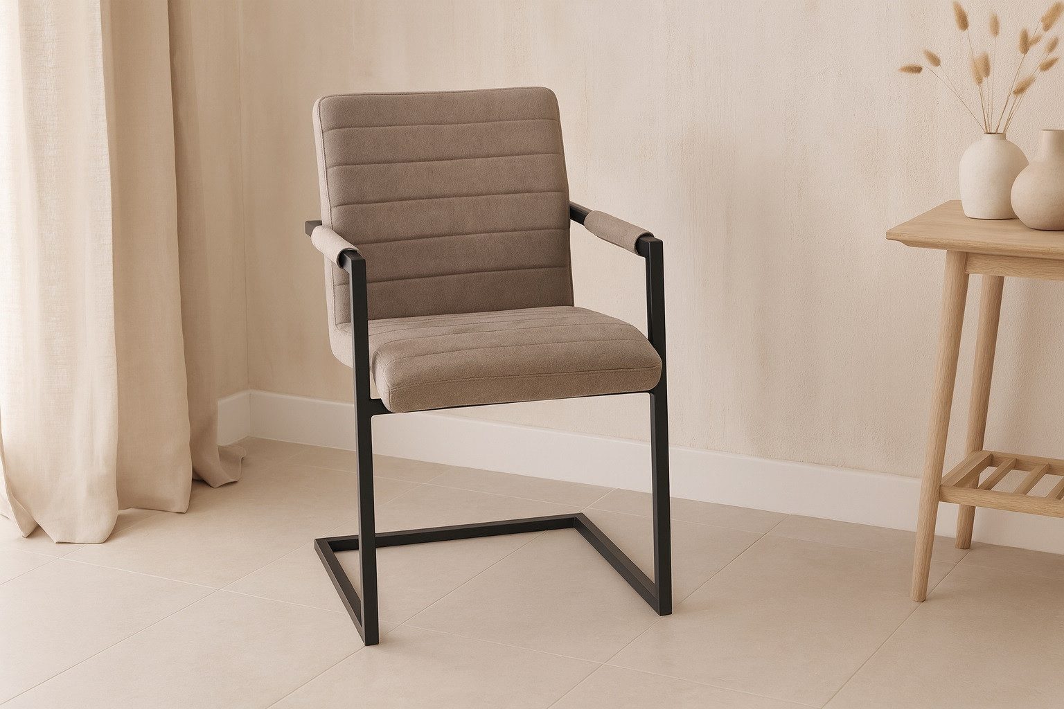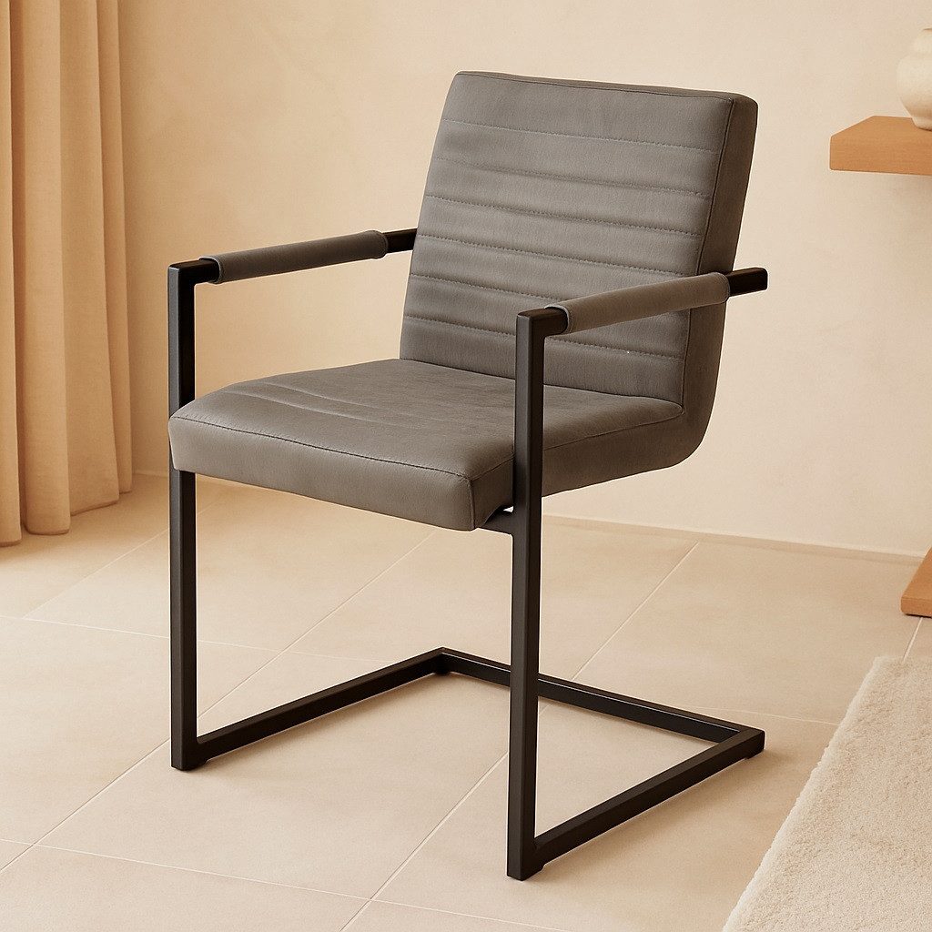 Robuster feststehender Freischwinger Stuhl; mit Armlehnen; Stoffbezug; Vintage Design