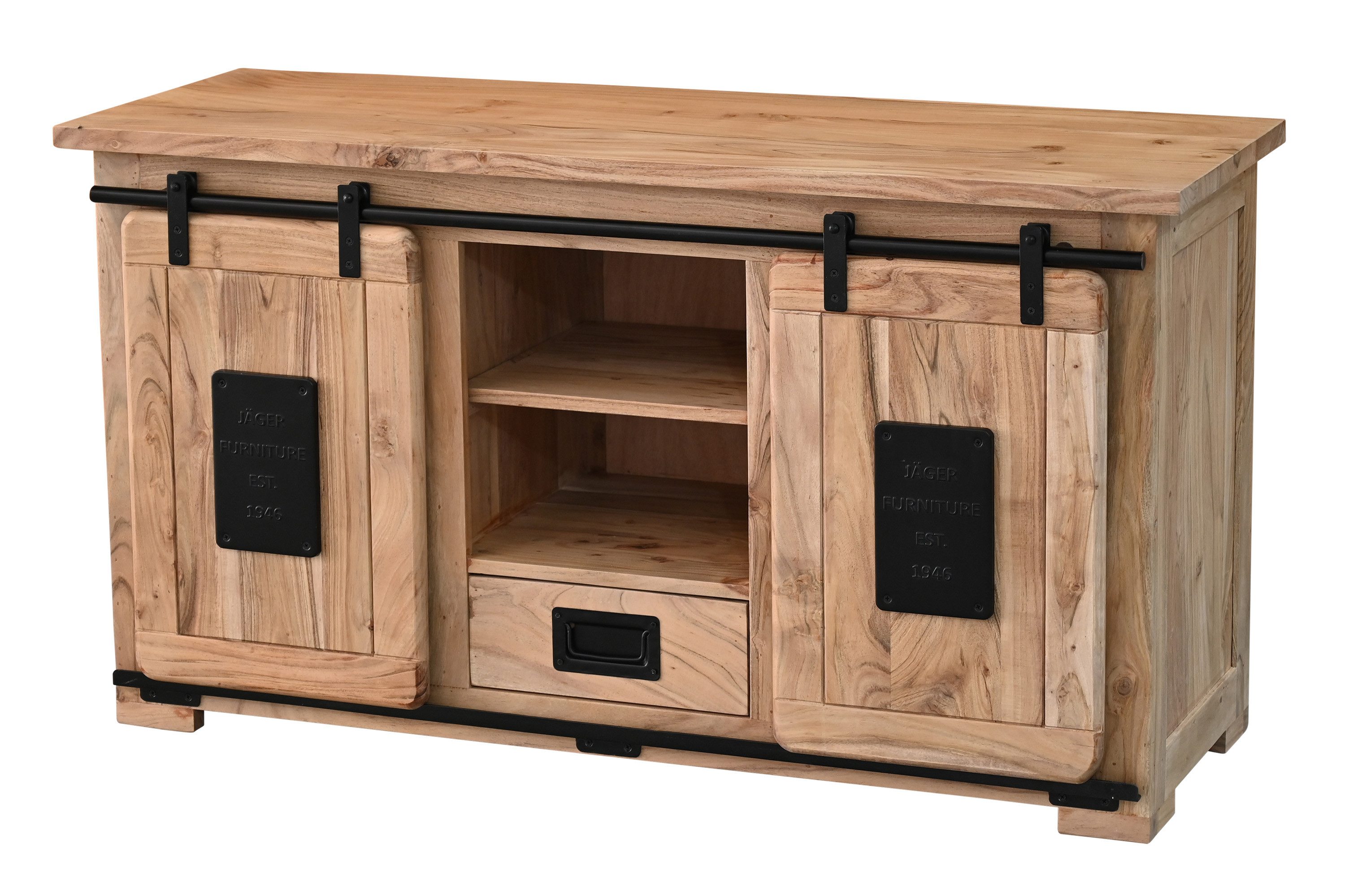 Hochwertiges Lowboard Gia, Akazienholz massiv +naturfarben, mit 2 Holzschiebetüren, Schublade & 6 offenen Fächern, 128 x 45x 70 cm