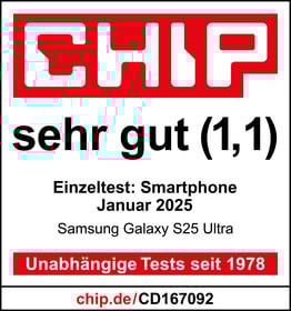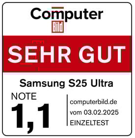 Testurteil von computerbild.de vom 10.02.2025, Ausgabe 03.02.2025, Seite artikel/cb-Tests-Handy-Samsung-S25-Galaxy-Ultra-Hands-On-Test-Review-39371573.html: "SEHR GUT (1,1)"