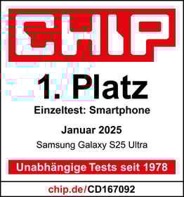 Das Onlinemagazin „CHIP.de“ testet das Samsung Galaxy S25 Ultra im Einzeltest. Die hervorragende Leistung erhält die Top-Note „1,0“. Das Smartphone ist „sehr gut“ ausgestattet. Der Akku ist sehr ausdauernd. Auch die Kamera ist sehr stark. Außerdem punktet das „riesige, brillante“ OLED-Display. Das Modell bietet „starke High-End-Technik“ und erreicht im Test die „CHIP“-Note „sehr gut (1,1)“.