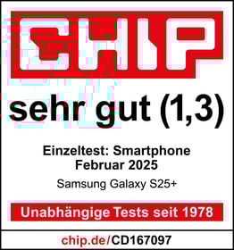 Testurteil von computerbild.de vom 01.02.2025, Ausgabe 01.02.2025, Seite artikel/cb-Tests-Handy-Samsung-S25-Plus-Test-Review-39372035.html: "SEHR GUT (1,2)"