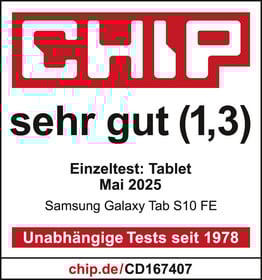 Das Samsung Galaxy Tab S10 FE erzielt im Einzeltest des Magazins „chip.de“ das Gesamtergebnis „Sehr gut (1,3)“. Die sehr lange Akkulaufzeit beträgt „fast 19 Stunden“. Die „sehr gute“ Ausstattung überzeugt u. a. mit einem S-Pen-Stylus im Zubehör sowie einer IP-68-Schutzklasse gegen Staub und Wasser. Das 10,9-Zoll-Display bietet eine hohe Darstellungsqualität. Außerdem bietet das Modell eine sehr hohe Leistung für Apps und Gaming. Insgesamt bietet das Tablet ein „tolles Gesamtpaket“ und erhält die Preiseinschätzung „sehr günstig (1,5)“ .