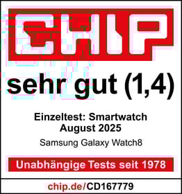 Die Samsung Galaxy Watch8 LTE erzielt im Einzeltest des Magazins „chip.de“ das Gesamtergebnis „Sehr gut (1,4)“. Die „sehr gute“ Ausstattung glänzt u. a. mit diversen Funktionen wie eSIM, Mobilfunk, GPS, NFC, Mobiles Bezahlen, einem Kompass und einer Sturzerkennung. Die „gute“ Akkulaufzeit beträgt „45:46 Stunden“. Außerdem ist das Gerät „sehr gut“ zu bedienen. Insgesamt ist das Modell eine „starke Smartwatch“.