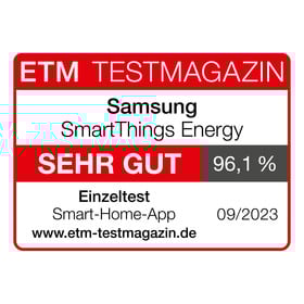 Das Testmagazin „ETM“ testet die App Samsung SmartThings Energy. Die Bedienung ist „exzellent“: Die Smart-Home-App ist sehr einfach einzurichten, zu koppeln und zu steuern. Die sehr starke Leistung überzeugt mit „sehr guter“ Automation und sehr nützlichen Hinweisen. Außerdem punktet die „sehr gute“ Gestaltung u. a. mit übersichtlichen Graphen zum Stromverbrauch im Haus. Die „eindrucksvolle“ App erreicht die Gesamtnote „sehr gut (96,1 %)“.