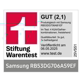 Testurteil von Stiftung Warentest vom 06.05.2025, Ausgabe 06.05.2025, Seite test.de/Kuehlschraenke-im-Test-4735177-0/: "GUT (2,1) - Produktgleich mit Samsung RB53DG706AB1EF"