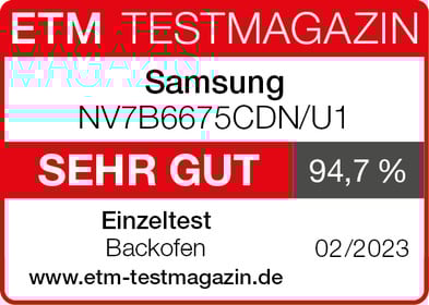 Das Testmagazin „ETM“ testet den Samsung NV7B6675CDN/U1 im Einzeltest. Die „sehr gute“ Leistung überzeugt u. a. mit „sehr gutem“ Backen und Grillen. Das Modell ist leicht zu handhaben und problemlos zu reinigen. Es ist „sehr gut“ ausgestattet, z. B. mit einem großen Spektrum an Garoptionen. Außerdem punktet der sehr niedrige Stromverbrauch. Der Backofen erreicht die Gesamtnote „sehr gut (94,7 %)“.