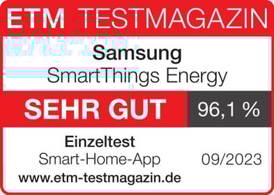 Das Testmagazin „ETM“ testet die App Samsung SmartThings Energy. Die Bedienung ist „exzellent“: Die Smart-Home-App ist sehr einfach einzurichten, zu koppeln und zu steuern. Die sehr starke Leistung überzeugt mit „sehr guter“ Automation und sehr nützlichen Hinweisen. Außerdem punktet die „sehr gute“ Gestaltung u. a. mit übersichtlichen Graphen zum Stromverbrauch im Haus. Die „eindrucksvolle“ App erreicht die Gesamtnote „sehr gut (96,1 %)“.